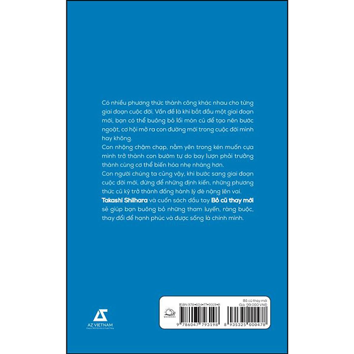 BỎ CŨ THAY MỚI Thất bại tại lối mòn. Thành công nhờ đột phá Giống như quá trình nhộng thoát khỏi vỏ kén để trở thành bướm, luôn gây ra những đớn đau. Nếu muốn bay xa hơn, sống sót được, đảm bảo bạn phải vượt qua những thử thách cuộc sống, chỉ cần bạn luôn nói với chính mình, bạn đang tìm kiếm điều gì và bạn sẽ đạt được. Và trong từng giai đoạn cuộc đời sẽ có những phương thức khác nhau để đạt được thành công. Vấn đề là khi bắt đầu một giai đoạn mới, đừng để những định kiến, những phương thức cũ kỹ trở thành đống hành lý đè nặng lên vai mình. Biết buông bỏ lối mòn để tạo bước đột phá, mở ra cơ hội mới cho cuộc đời mình. Takashi Shiihara và cuốn sách đầu tay “Bỏ cũ thay mới” sẽ giúp bạn biết cách “Sảng khoái buông bỏ” những tham luyến, ràng buộ Thay đổi để hạnh phúc và được sống là chính mình. Sách được phát hành bởi thương hiệu sách trẻ Wavebooks với sứ mệnh trở thành người bạn đồng hành tin cậy cho quá trình phát triển kỹ năng và tâm hồn người Việt trẻ.
