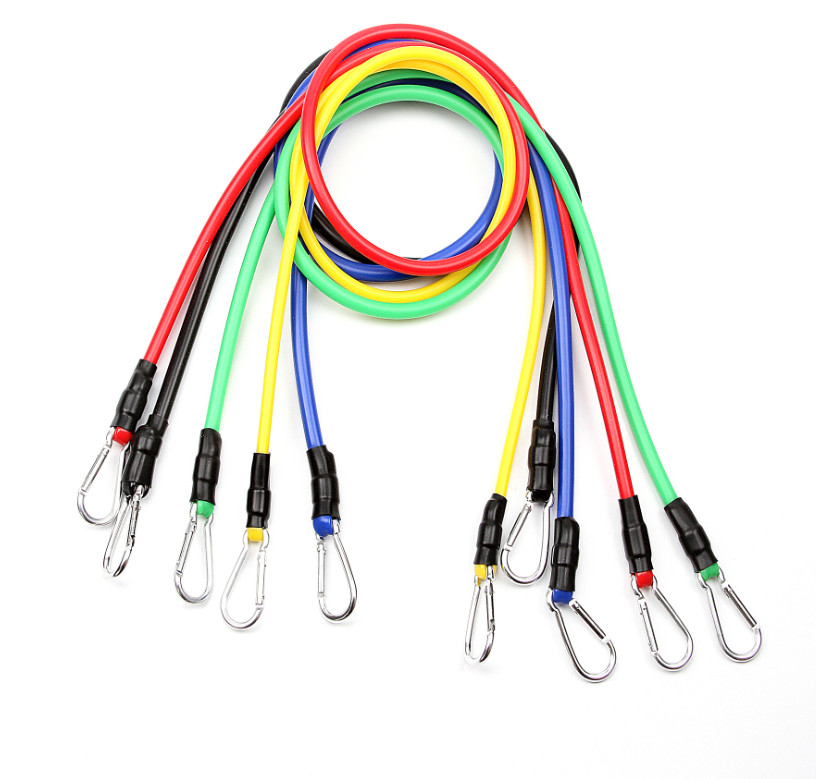 Bộ dây đàn hồi tập thể lực có 5 dây, mỗi dây có mức trọng lượng khác nhau, từ nhẹ tới nặng (8 lbs, 15 lbs, 20 lbs, 25 lbs, 30 lbs) có thể