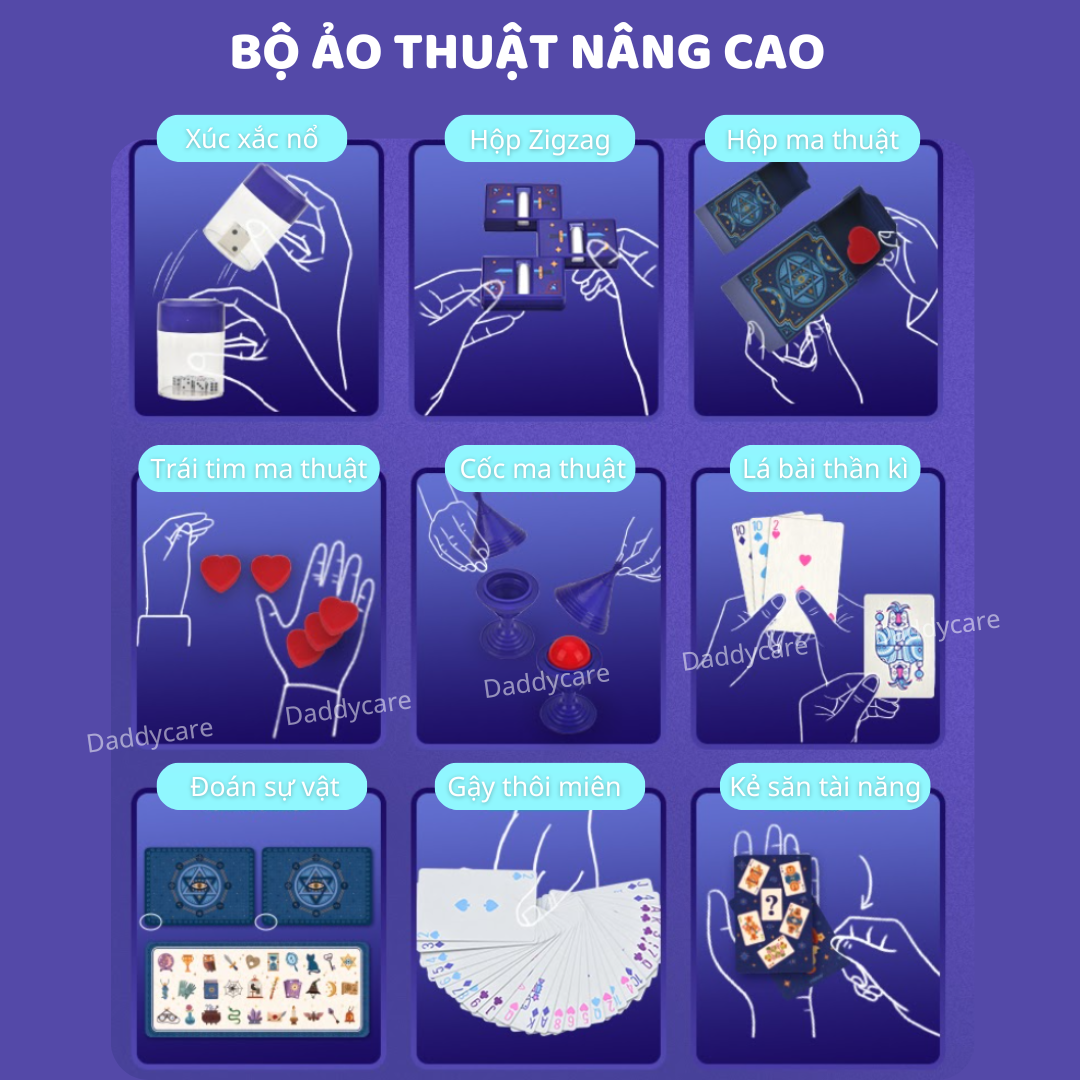 - Kích cỡ: Bộ ảo thuật 21 dụng cụ ( 40cm x 32cm x 7.7cm ), Bộ 6 dụng cụ ( 28.4cm x 17.4cm x 13.5cm )
