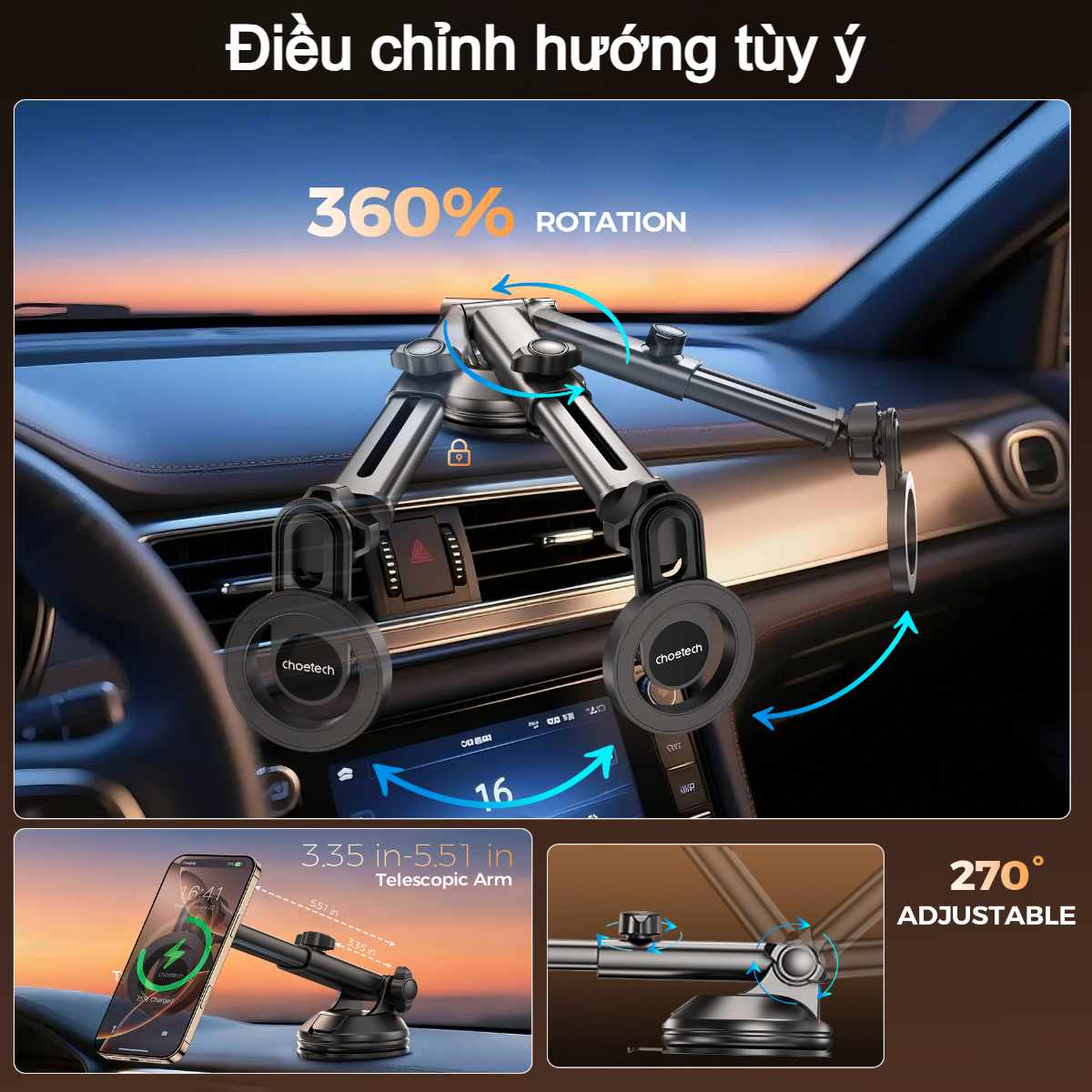 - Bộ sản phẩm bao gồm: 1 giá đỡ điện thoại nam châm Choetech H01005 1 đế hút chân không gắn taplo 1 đầu kẹp khe gió 1 Hướng dẫn sử dụng – Bộ giá đỡ điện thoại hít nam châm 2in1 Choetech H01005 là phụ kiện tiện ích dành cho xe ô tô, giúp người dùng giữ điện thoại cố định an toàn khi lái xe. Với thiết kế thông minh, sản phẩm có thể gắn linh hoạt trên taplo bằng đế hút chân không hoặc kẹp vào khe gió tùy theo nhu cầu sử dụng. Khả năng hít nam châm mạnh mẽ cùng kiểu dáng hiện đại mang lại trải nghiệm sử dụng tiện lợi và thẩm mỹ cho không gian nội thất xe. Thông tin chi tiết Chất liệu cao cấp, độ bền vượt trội – Choetech H01005 được gia công từ vật liệu nhựa ABS cao cấp kết hợp kim loại chắc chắn, mang lại độ bền cao trong quá trình sử dụng lâu dài. Đế hút được trang bị lớp keo gel có thể rửa sạch và tái sử dụng nhiều lần, giữ độ bám ổn định trên bề mặt taplo hoặc kính xe. Thiết kế 2in1 linh hoạt – Choetech H01005 đi kèm hai dạng gắn gồm đế hút chân không và kẹp khe gió, cho phép người dùng tùy chỉnh vị trí lắp đặt phù hợp với mọi loại xe. Cần đỡ có thể kéo dài và điều chỉnh độ cao góc nghiêng, giúp tối ưu hóa tầm nhìn khi xem bản đồ, nhận cuộc gọi hoặc sử dụng điện thoại khi dừng xe. Xoay 360 độ, điều chỉnh góc nhìn dễ dàng – Khớp xoay linh hoạt cho phép người dùng xoay ngang dọc điện thoại tùy theo nhu cầu sử dụng. Dù bạn cần quan sát màn hình theo chiều dọc để xem tin nhắn hay xoay ngang để xem bản đồ thì sản phẩm vẫn đảm bảo cố định và an toàn. Hít nam châm siêu mạnh, giữ điện thoại chắc chắn – Giá đỡ sử dụng hệ thống nam châm lực hút cao, giúp giữ chắc điện thoại ngay cả khi xe di chuyển trên địa hình gồ ghề. Sản phẩm đặc biệt tương thích với dòng i-Phone có tích hợp Mag-Safe hoặc các thiết bị khác đã gắn vòng kim loại. Tương thích rộng rãi – Phù hợp với đa số các dòng smartphone hiện nay như i-Phone, Sam-sung, Xiao-mi, Op-po, Vi-vo và nhiều thiết bị khác có trang bị vòng nam châm hoặc ốp Mag-Safe. – Sản phẩm lý tưởng cho người lái xe cá nhân hoặc tài xế công nghệ, giúp điện thoại luôn trong tầm tay, đảm bảo an toàn khi sử dụng Google-Maps, nghe gọi hoặc giải trí mà không làm mất tập trung khi lái xe. Hình ảnh Bộ giá đỡ điện thoại hít nam châm 2in 1 Choetech H01005 dán taplo hoặc kẹp khe gió xoay 360 độ (Hàng chính hãng)