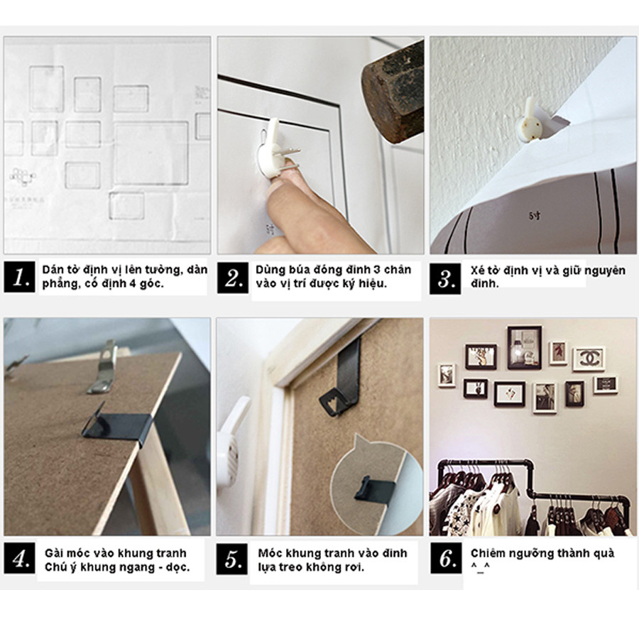 - Bước 4: Móc hết khung ảnh lên đinh đã đóng, chú ý móc đinh và móc khung phải khớp với nhau.