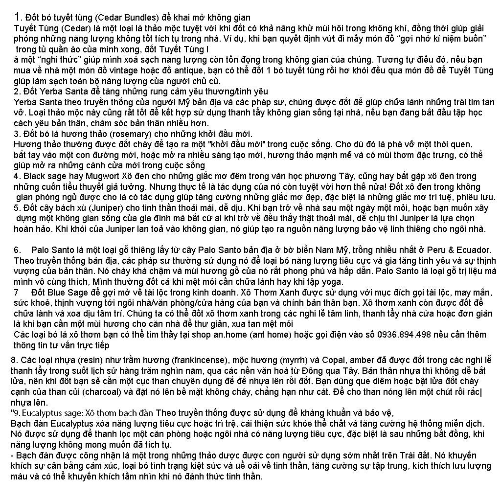 - Dragons Blood Sage - Xô thơm huyết rồng. Loại có sức mạnh nhất trong việc dùng thanh lọc và bảo vệ tinh thần mạnh mẽ nhất. Giúp thiêu huỷ tinh thần tiêu cực và được cho là hỗ trợ thu hút những gì bạn mong muốn.