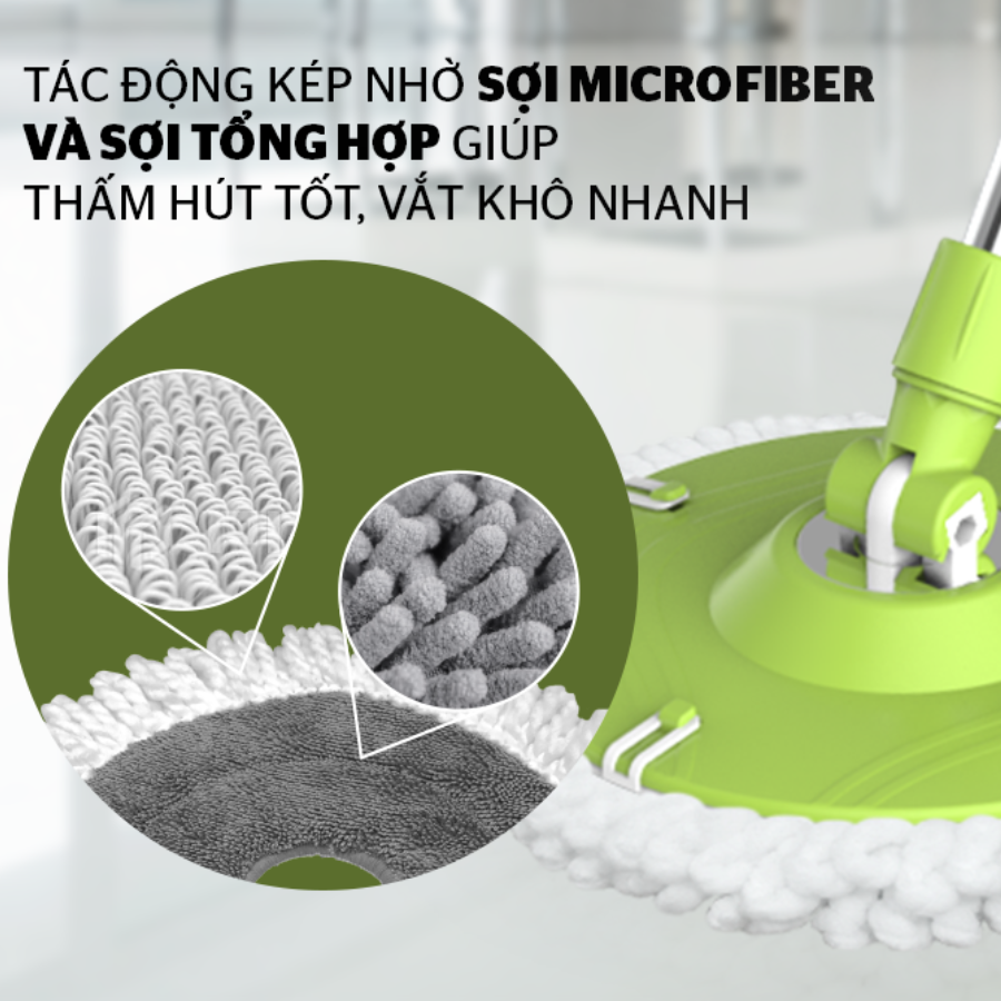 Bông lau tác động kép nhờ sợi Microfiber và sợi tổng hợp thấm hút tốt, vắt khô nhanh