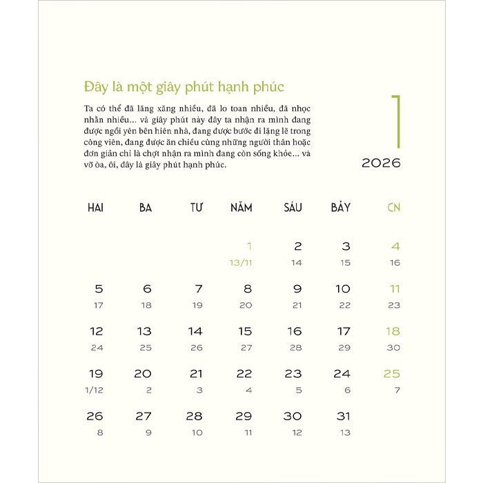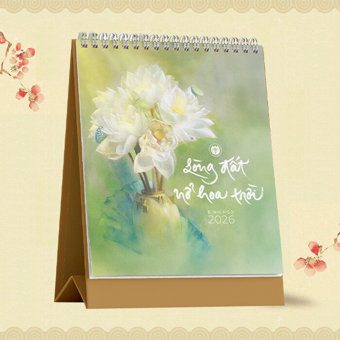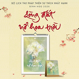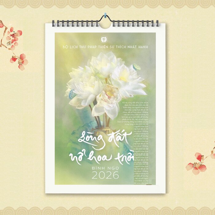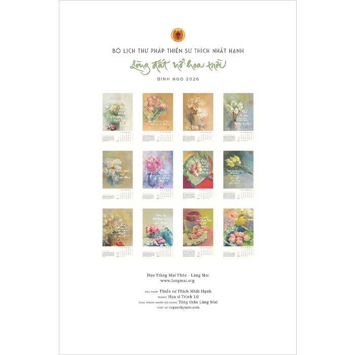 Bộ Lịch Thư Pháp Làng Mai - Bính Ngọ 2026 “Trên mảnh đất tâm, hoa hiểu biết và thương yêu nở.” - Thiền sư Thích Nhất Hạnh Một năm mới bắt đầu từ sự trở về Khi xuân về, vạn vật như được làm mới - cành cây đâm chồi, hoa lá nở rộ, lòng người nhẹ nhõm. Trong khoảnh khắc giao mùa ấy, “Lòng đất nở hoa trời” - một hình ảnh đầy chất thơ gợi mở mối liên hệ sâu sắc giữa “đất” (thân tâm ta, nơi tiếp xúc với hiện tại) và “trời” (chánh niệm, an nhiên, hiểu biết và từ bi). Hạnh phúc không ở đâu xa, mà hiện hữu ngay nơi từng bước chân, từng hơi thở. Khi ta biết trở về, sống sâu sắc và thật sự tiếp xúc với hiện tại - đất hóa trời, khổ đau hóa an lạc, hoa giác ngộ nở rộ từ trong lòng đất mộc mạc. Bộ lịch thư pháp 2026 - Món quà nuôi dưỡng thân tâm Năm nay, Tăng thân Làng Mai cùng  trân trọng gửi đến bạn ấn phẩm lịch đặc biệt với chủ đề “Lòng đất nở hoa trời”. Mỗi tờ lịch không chỉ là một mốc thời gian, mà còn là một cánh cửa nhỏ dẫn về chánh niệm - nhắc ta dừng lại, thở sâu và sống thật. Mỗi tháng - Một thông điệp nuôi dưỡng Lịch gồm 12 thông điệp thư pháp nhẹ nhàng, sâu sắc từ  như: Thở đi con, thở thật sâu thật chậm, không sao đâu; Lắng nghe; Con về nương tựa đất Mẹ; Lòng hôm ấy sẽ là lòng muôn thuở; Đây là một giây phút hạnh phúc…kết hợp cùng tranh hoa sen của hoạ sĩ  - biểu tượng của giác ngộ và thanh tịnh, nở lên từ lòng đất, như nhắc ta: hạnh phúc và hiểu biết có thể bắt đầu từ chính nơi ta đang đứng. Món quà tinh thần cho chính bạn và người thương Hãy để bộ lịch “Lòng đất nở hoa trời” trở thành người bạn đồng hành trong năm mới - nhẹ nhàng nhắc nhở bạn quay về với chính mình, mỗi ngày. Thông tin chi tiết Lịch treo tường: