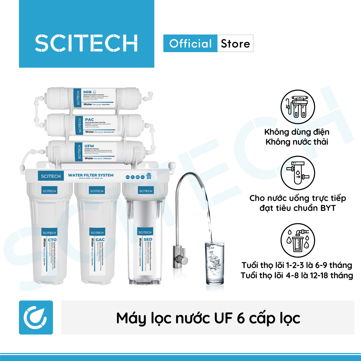 Bộ lọc nước uống công nghệ UF 6 cấp lọc giúp lọc sạch cặn bẩn, rỉ sét, rong rêu, chất hữu cơ và các tạp chất khác lẫn trong nước. Bộ lọc thích hợp dùng