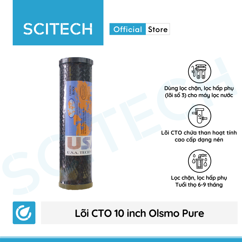 Lõi CTO 10 inch Olsmo Pure xuất xứ Malaysia sử dụng vật liệu than hoạt tính gáo dừa tự nhiên cao cấp dạng nén (than hoạt tính được xay nhỏ sau đó ép bằng máy