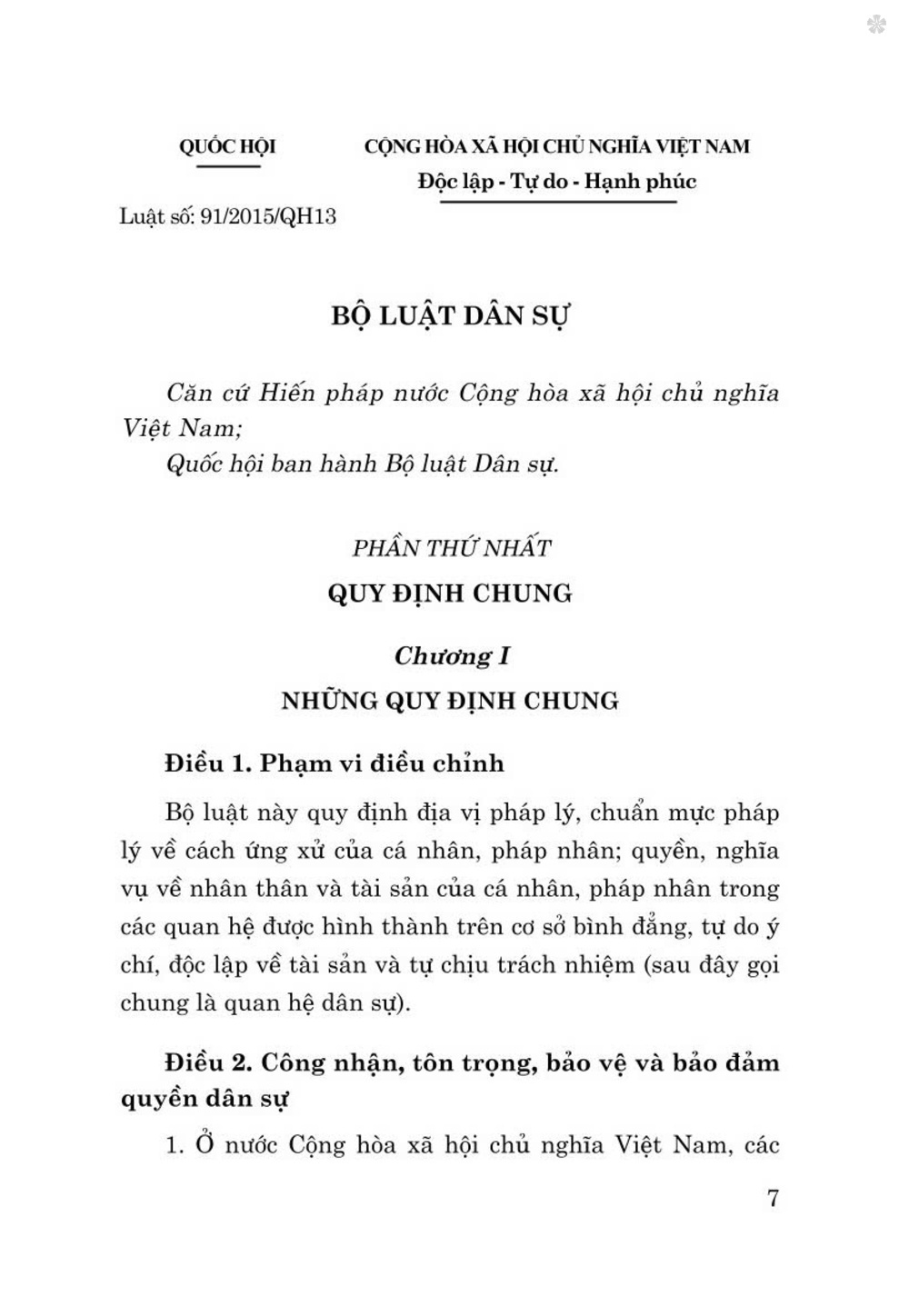 Bộ luật Dân sự số 91/2015/QH13 được thông qua ngày 24-11-2015 tại kỳ họp thứ 10 Quốc hội nước Cộng hòa xã hội chủ nghĩa Việt Nam khóa XIII, thay thế Bộ luật Dân sự