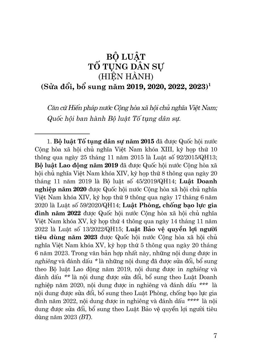 Ngày 24/11/2015, tại kỳ họp thứ 10, Quốc hội khóa XIII nước Cộng hòa xã hội chủ nghĩa Việt Nam đã thông qua Bộ luật Dăn sự, Bộ luật có hiệu lực