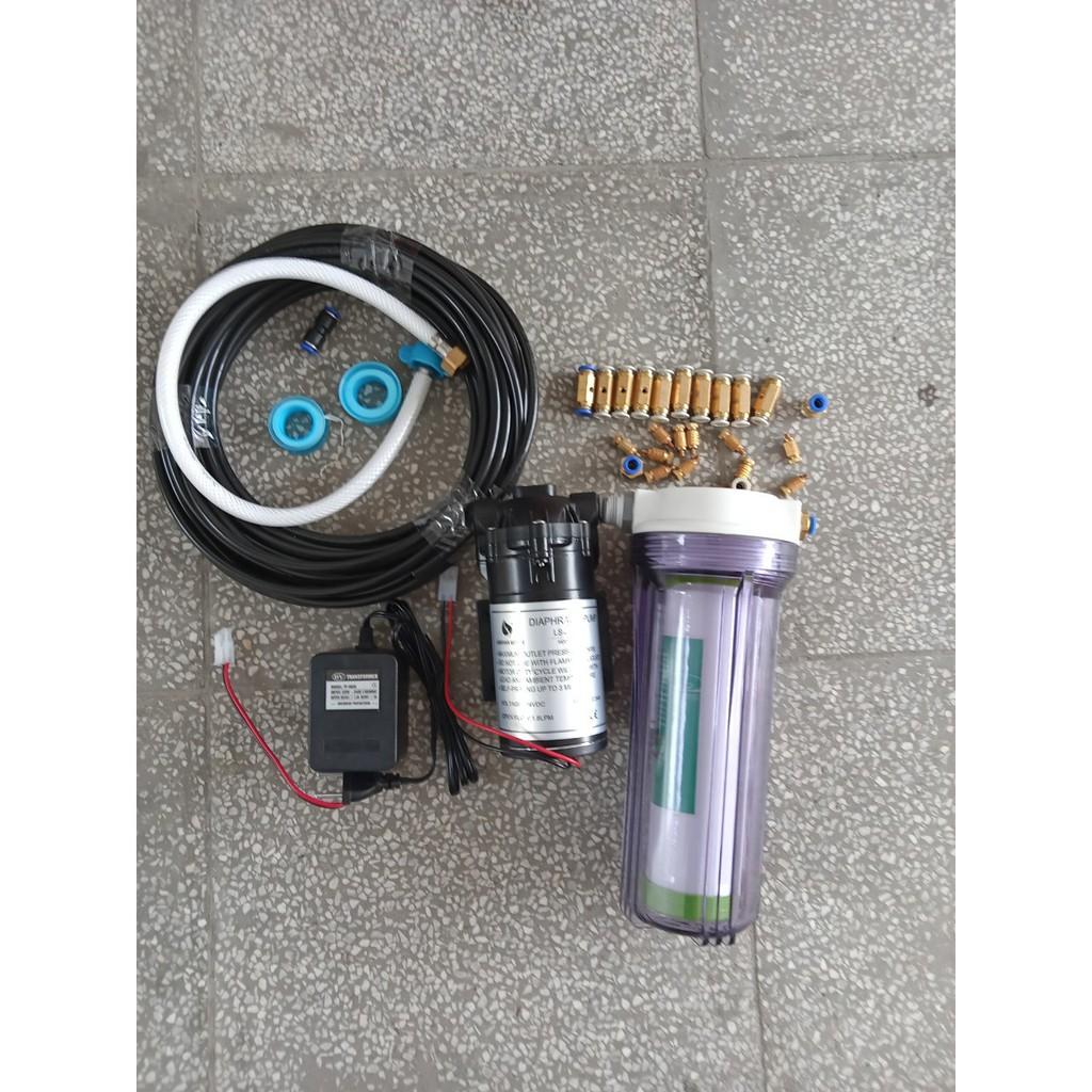 Bộ phun sương 10 béc đồng tạo ẩm làm mát không khí và tưới lan có sẵn máy bơm áp lực