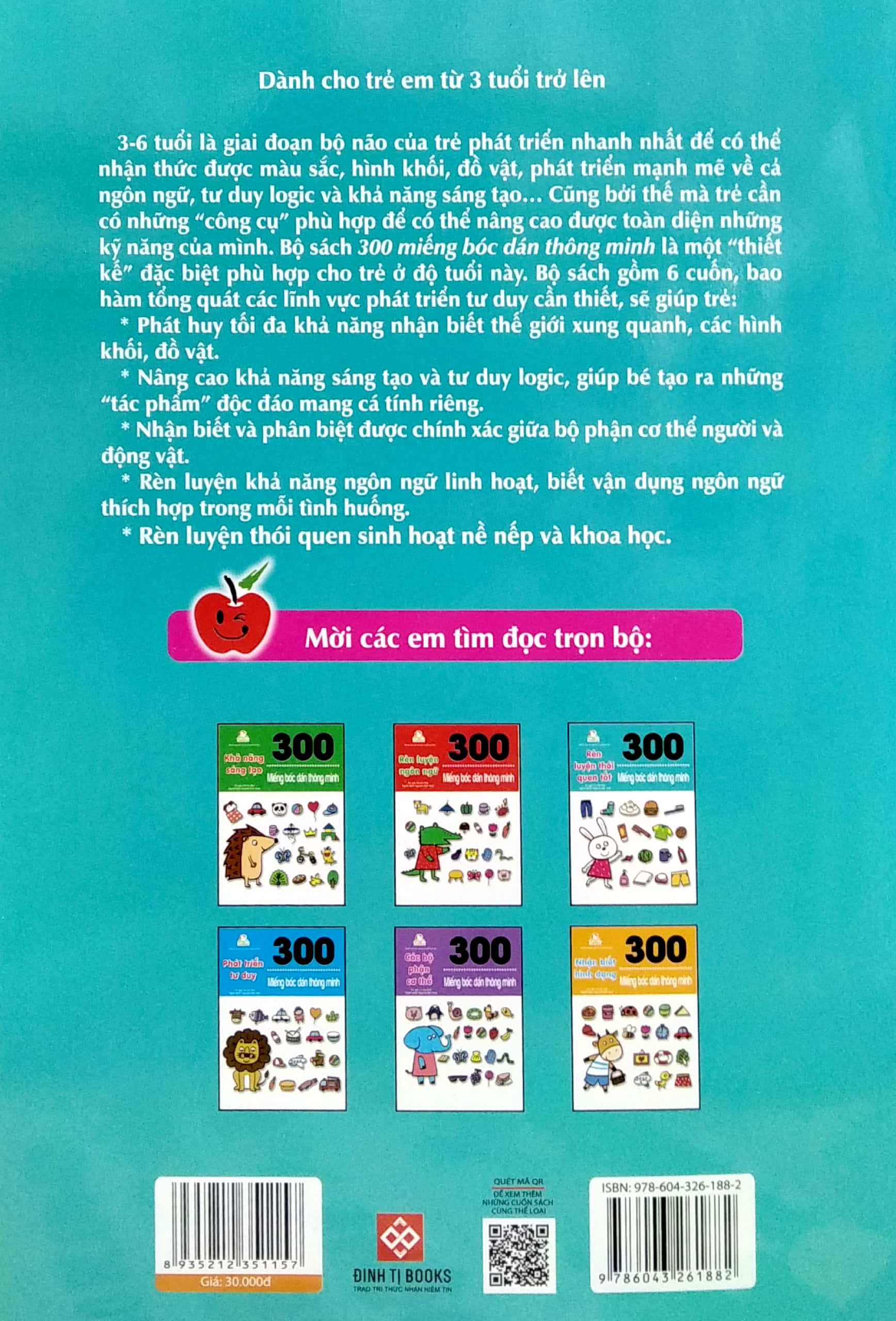 3-6 tuổi là giai đoạn bộ não của trẻ phát triển nhanh nhất để có thể nhận thức được màu sắc, hình khối, đồ vật, phát triển mạnh mẽ về cả ngôn ngữ, tư duy logic và khả năng sáng tạo... Cũng bởi thế mà trẻ cần có những "công cụ" phù hợp để có thể nâng cao được toàn diện những kỹ năng của mình. Bộ sách 300 miếng bóc dán thông minh là một "thiết kế" đặc biệt phù hợp cho trẻ ở độ tuổi này. Bộ sách gồm 6 cuốn, bao hàm tổng quát các lĩnh vực phát triển tư duy cần thiết, sẽ giúp trẻ: