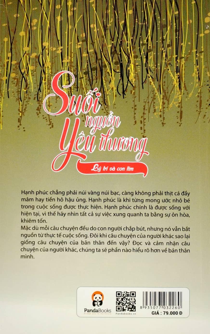 - Suối Nguồn Yêu Thương – Sống Để Yêu Đời Yêu Thương Lời giới thiệu Đôi khi hạnh phúc giống như nắm cát trong tay, nắm càng chặt mất đi càng nhanh. Đôi khi hạnh phúc lại giống bông hoa bên bờ sông, thoắt ẩn thoắt hiện, rất khó chạm tay. Chẳng có gì là đúng hay sai một cách tuyệt đối, càng không có quá nhiều thù và hận, tại sao lại không xem nhẹ tất cả? Có thể người thật lòng cho đi chưa chắc đã được đền đáp, nhưng bạn đừng hối tiếc, có một trái tim bình thản, phẳng lặng chưa chắc đã không phải điều hay. Có thể ngày mai vẫn còn là một ẩn số, nhưng điều đó có gì đáng ngại, hãy tin tương lai sẽ không tồi tệ, hãy tin ông trời công bằng với mỗi con người. Đó chính là điều mà cuốn sách “SUỐI NGUỒN YÊU THƯƠNG – SỐNG ĐỂ YÊU ĐỜI YÊU THƯƠNG” muốn gửi đến bạn đọc, để chúng ta sống chậm lại trong thế giới phức tạp, náo nhiệt và có phần thiên về vật chất hiện nay. Nội dung cuốn sách thể hiện rõ qua 3 chương: Chương I: Gió thoảng, mây hững hờ trôi Không tính toán thiệt hơn, ngắm hoa nở tàn trước sân; không quan tâm được mất nhìn mây cuộn trôi trên trời. Điềm tĩnh nhìn nhận được mất, trầm tĩnh nhìn thấu phồn hoa; khi xuôi chèo mát mái không khoe khoang, khi khốn khó gian nan không ủ rũ. Điềm tĩnh trước tất cả vinh nhục, điềm tĩnh trước mọi danh lợi, điềm tĩnh trước tất cả cám dỗ và điềm tĩnh tận trong xương cốt. Sự điềm tĩnh đó có thể giúp ta đứng vững trong thế giới coi trọng vật chất hiện nay, giúp chúng ta xóa tan lo âu, rối bời, quan sát thời thế, khước từ vinh hoa, quay về với hồn hậu, chất phác, đạt đến cảnh giới “ hoa rơi lặng thinh, người nhẹ tựa hương cúc”. Chương II: Những tháng ngày yên bình Cuộc đời mỗi con người có 5% hưng phấn, 5% đau thương và 90% yên bình. Vì 5% hưng phấn mà chúng ta chịu đựng 5% đau thương và đi qua 90% yên bình. Tất cả mọi việc dù là đơn giản nhất đều sẽ trở lại trạng thái ban đầu vốn có của nó. Nhiều năm sau, nếu bạn có một tình yêu, nếu bạn phải duy trí một tình yêu, bạn nhất định cần để tình yêu đó vượt qua thử thách là những ngày tháng yên bình, phẳng lặng, không gợn sóng, thậm chí tẻ nhạt. Bởi vì đó chính là tình tyêu bền chặt nhất. Chương III: Nếu yêu xin hãy yêu sâu đậm Chuyện tình bất hut nhất, lãng mạn nhất chẳng phải cũng luôn bắt nguồn từ cuộc sống phẳng lặng đó sao, nhưng nó bắt nguồn từ những trái tim chân thành không bao giờ hối tiếc. Chỉ cần bạn tin vào tình yêu, hạnh phúc sẽ luôn ở trái tim bạn. Toàn tâm toàn ý để yêu một người, tức là bạn đã sở hữu niềm hạnh phúc lớn nhất trên thế gian này.