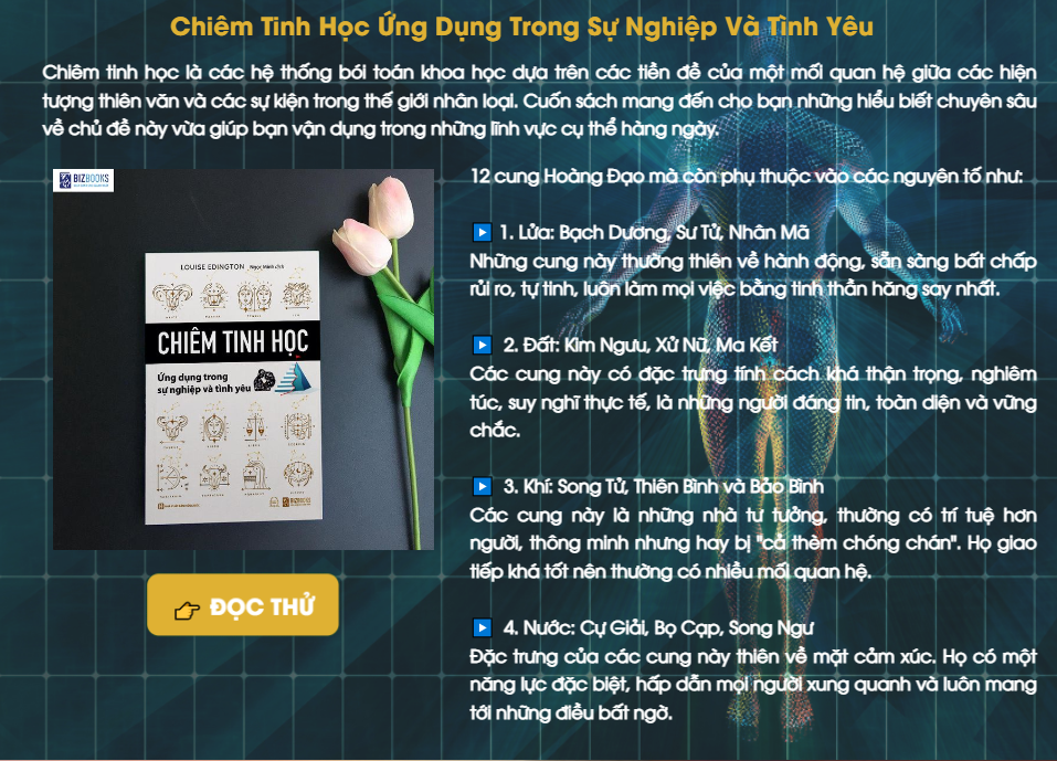 Có khi trong cuốn sách Chiêm Tinh Học Ứng Dụng Trong Sự Nghiệp Và Tình Yêu Ngay khi đọc cuốn sách này bạn hãy lấy một tờ giấy và viết ra mình thuộc cung hoàng đạo nào, nguyên tố đặc trưng là gì để xem ứng dụng bạn nhé.
