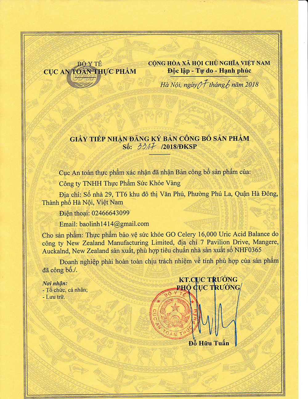 - Có bán tại các nhà thuốc uy tín trên cả nước THÔNG TIN VỀ GO CELERY 16,000 NEW ZEALAND (Theo Giấy đăng ký sản phẩm của Bộ Y Tế: 3317/2018/ ĐKSP) THÀNH PHẦN: mỗi viên chứa