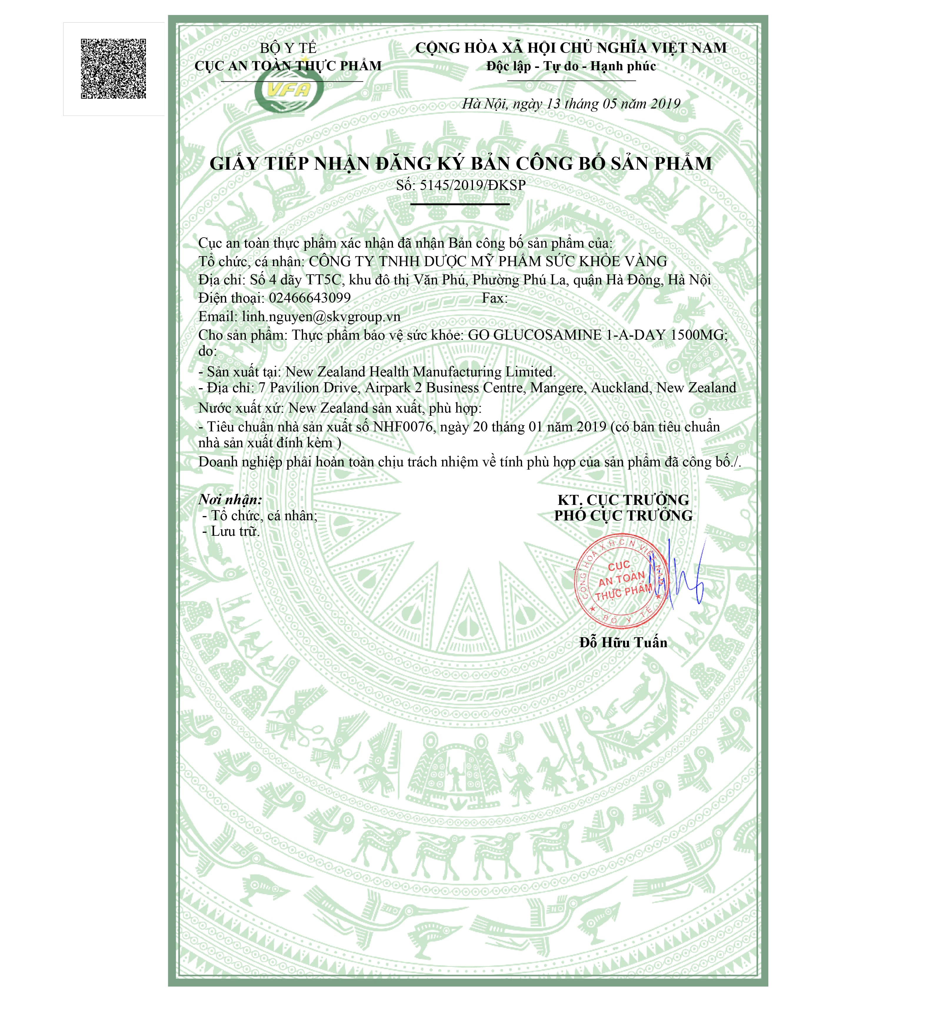 - Chỉ 1 viên 1 ngày dễ dangg sử dụng. ĐỐI TƯỢNG SỬ DỤNG: Người trưởng thành LIỀU DÙNG: Uống 1 viên mỗi ngày với bữa ăn hoặc theo chỉ dẫn của chuyên gia y tế. SỐ ĐKSP (BỘ Y TẾ): 8448/2023/ĐKSP LƯU Ý: • Thực phẩm này không phải là thuốc, không có tác dụng thay thế thuốc chữa bệnh. • Người đang dùng thuốc tham khảo ý kiến chuyên gia y tế trước khi sử dụng. • Không sử dụng cho phụ nữ mang thai hoặc đang cho con bú, người có mẫn cảm, kiêng kỵ với bất kỳ thành phần nào của sản phẩm. • Luôn đọc kỹ nhãn. Chỉ uống theo hướng dẫn sử dụng. Nếu dùng thuốc theo toa hoặc nếu đang nghi ngờ, hãy tham khải ý kiến Chuyên gia Viên xương khớp GO Glucosamine 1-A-Day 1500mg 30 viên Viên Xương Khớp GO Glucosamine 1-A-Day 1500mg New Zealand được bào chế tại nhà máy đạt chuẩn GMP với hệ thống kiểm soát chất lượng nghiêm ngặt của New Zealand. Mỗi viên nang bổ sung 1500mg Glucosamine Sulfate, Chondroitin và các hoạt chất nuôi dưỡng xương, sụn, khớp khỏe mạnh. Số 1 New Zealand - Nhập khẩu chính hãng Trong cuộc khảo sát gần đây của hãng nghiên cứu thị trường Canstar Blue NZ, GO HEALTHY đã vượt qua các thương hiệu nổi tiếng khác để nhận được "Giải Thưởng Khách Hàng Ưu Thích Nhất - Multivitamins năm 2016 ", trong đó Go Glucosamine là được người dân New Zealand bình chọn là sản phẩm xương khớp số 1 trong 5 năm liên tục (2012 - 2016). Vì sao GO Glucosamine được người dân New Zealand ưu chuộng nhất trong nhiều năm như vậy? CÔNG THỨC TIÊN TIẾN - 9 TRONG 1 Công thức vượt trội 9 thành phần kết hợp Glucosamine Sulfate, Chondroitin và các dưỡng chất nuôi dưỡng xương, khớp, sụn, cơ. Glucosamine Sulfate 1,500mg kết hợp Nghệ & Gừng tăng cường chống viêm cho ổ khớp và chống kích ứng dạ dày; kết hợp Đồng, Mangan và Proline tăng cường chắc khỏe hệ cơ-gân-xương & hỗ trợ cân bằng nồng độ acid uric. THÀNH PHẦN có trong mỗi viên nang: Glucosamine Sulfate Postassium Cloride Complex 1500mg Chondroitin Sulfate 155mg Chiết xuất gừng 250mg Chiết xuất nghệ 100mg Chiết xuất cần tây 100mg Vitamin D3 100IU Đồng Sulfate (Tương đương Đồng 166 mcg) 653mcg Manganese Sulfate ( Tương đương Mangan 1mg) 3.2mg Hàm lượng Proline 50mcg CÔNG DỤNG CỦA VIÊN UỐNG GLUCOSAMINE :