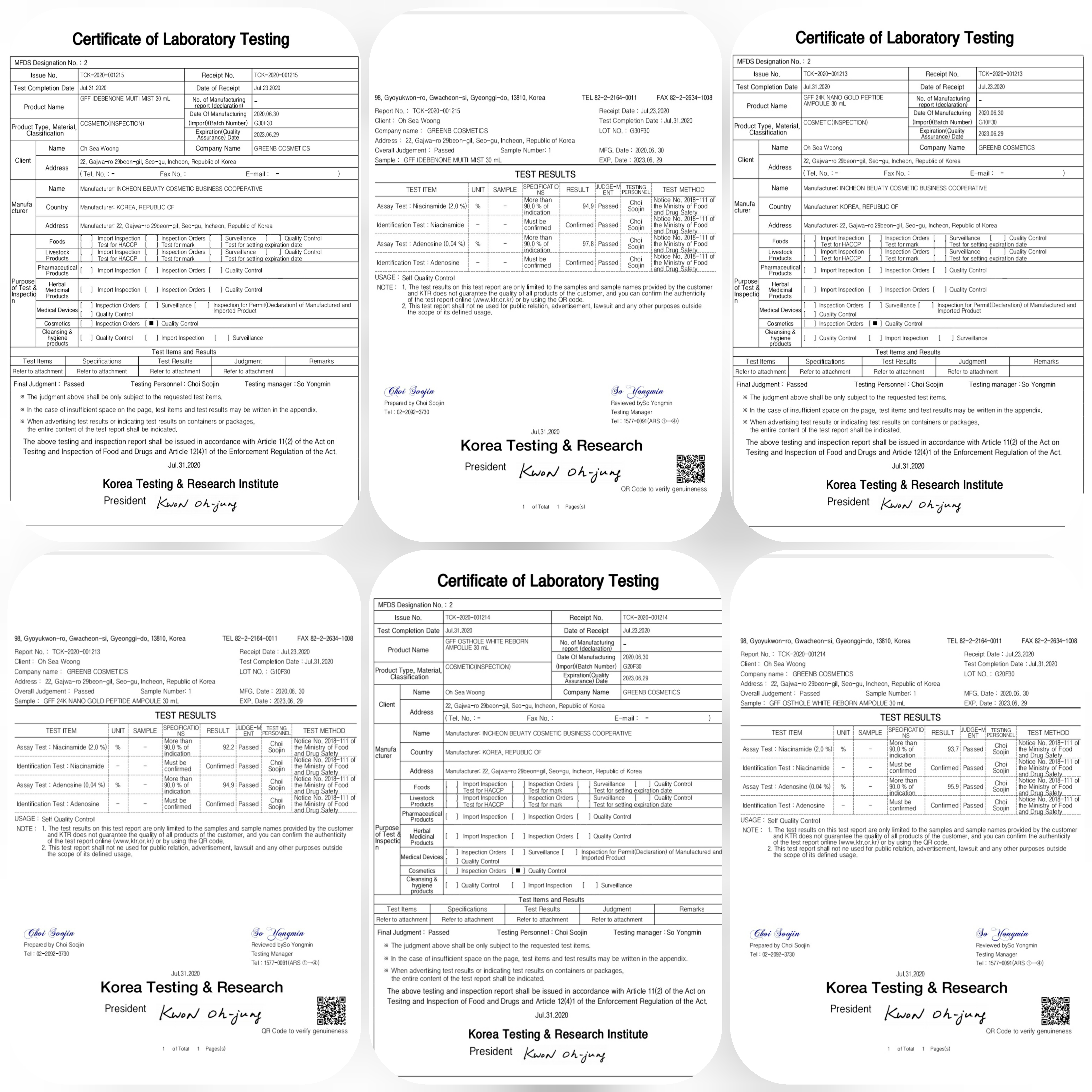 GFF chỉ bao gồm các thành phần có nguồn gốc từ tự nhiên cấp xanh lá, đã được Bộ An toàn Thực phẩm và Dược phẩm Hàn Quốc phê duyệt, là một loại mỹ phẩm có chức năng kép giúp cải thiện nếp nhăn và dưỡng trắng da.