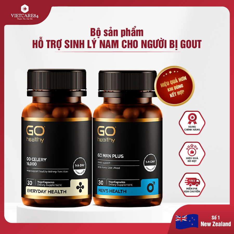 Bộ sản phẩm nhập khẩu chính hãng tăng cường sinh lực, sinh lý nam cho người bị gout gồm: + Viên gout GO CELERY 16000mg (30 viên) + Viên uống tăng cường sinh lý nam