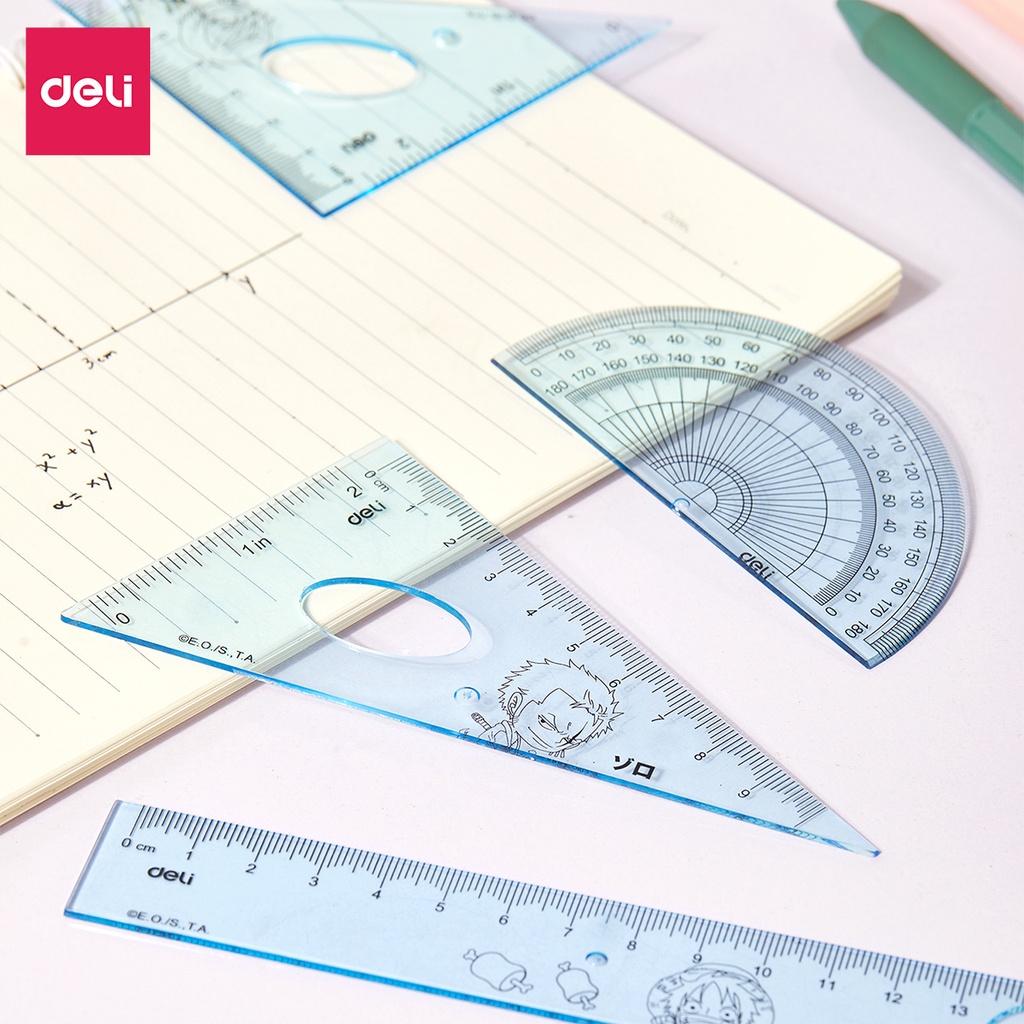 THÔNG TIN SẢN PHẨM: Tên sản phẩm: Thước học sinh ONE PIECE x Deli ️ Mã sản phẩm: EH17 ️4 Phụ kiện: -Thước kẻ 15cm -Thước tam giác cân -Thước tam giác vuông -Thước đo độ/ thước đo góc