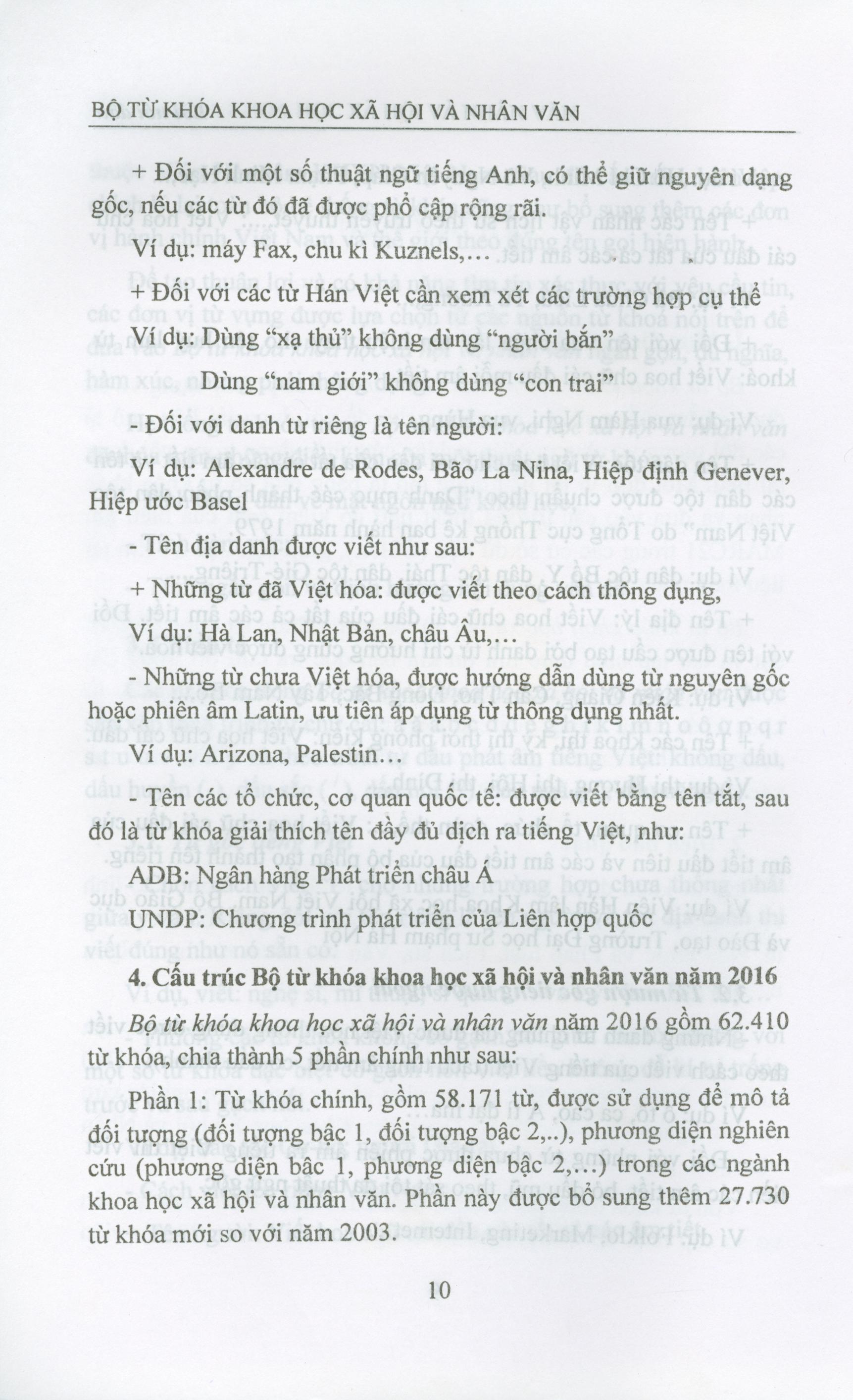 Bộ từ khóa được biên soạn gồm 62.410 từ, thuộc các lĩnh vực khoa học xã hội và nhân văn như: Triết học, xã hội học, kinh tế, nhà nước và pháp luật, lịch sử, văn hóa, dân tộc học, ngôn ngữ học, văn học, khảo cổ học, tâm lý học
