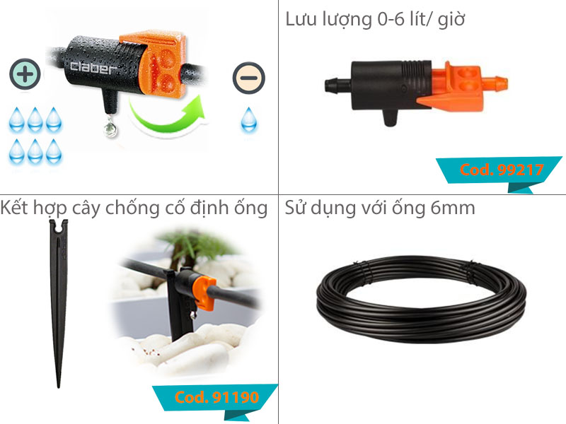 - Các sản phẩm của Claber được làm từ chất liệu nhựa cao cấp, mang đến sản phẩm có chất lượng tuyệt vời, sử dụng bền lâu. Sản phẩm có khả năng chống chọi với điều kiện thất thường của môi trường, luôn giữ được độ bền đẹp và độ nhanh nhạy, chính xác. - Bộ hệ thống tưới nhỏ giọt bao gồm: