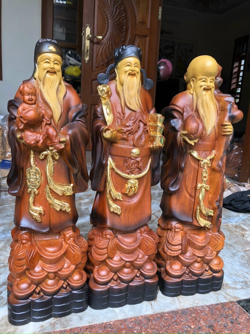 ✨Bộ tượng phật tam đa phúc lộc thọ bằng gỗ hương đá tô làm mầu giả cổ kt 50×16×13cm