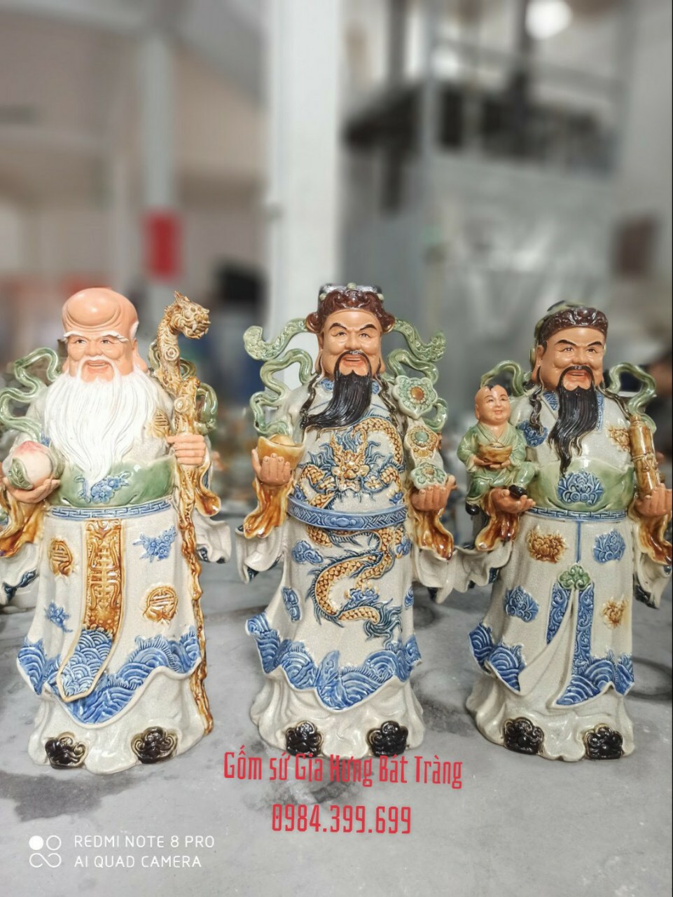 - Áp dụng: Trưng bày,Quà tặng, quà biế Ông Phúc: mang đến sự may mắn, an lành. Trong chuyện xưa, ông Phúc là một vị quan thanh liêm, làm đến chức Thừa tướng đời nhà Đường. Ông và vợ sống hạnh phúc, con đàn cháu đống. Đến năm 83 tuổi là đã có chút trai (ngũ đại đồng đường). Vì vậy, trên tay ông Phúc thường bế một đứa bé trai. Ngoài tượng ông Phúc, trong những ngày Tết, mọi người còn hay dán tranh chữ Phúc treo ngược, trong Hán Việt có nghĩa là ‘đáo phúc’ – phúc lại đến. Ông Lộc: tượng trưng cho sự giàu có, thịnh vượng. Ông làm quan đến chức Thừa tướng nhà Tấn. Vàng bạc, châu báu trong nhà chất cao như núi. Ông thường mặc áo màu xanh lá cây vì “lộc” phát âm gần với lục”. Tuy giàu có, nhưng ông lại mất vì bệnh tật khi mới ngoài ngũ tuần và không có con cái hương khói. Ông Thọ: Ông Thọ tên làm Thừa tướng đời Hán. Ông thọ đến 125 tuổi. Nên người đời mới gọi ông là ông Thọ. Ông Thọ tượng trưng cho sự sống lâu với hình ảnh là một ông già râu tóc bạc trắng, trán hói và dô cao, tay cầm quả đào hoặc gậy chống. CƠ SỞ SẢN XUẤT GỐM SỨ GIA HƯNG BÁT TRÀNG Cơ sở 1: Xóm 5 Giang Cao – Bát Tràng – Gia Lâm – Hà Nội Cơ sở 2: Số 17/27 Võng Thị – Tây Hồ – Hà Nội Hãy liên hệ với chúng tôi để có giá tốt nhất Hotline: 0984.399.699