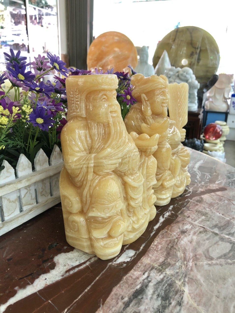 Chất liệu: Đá ngọc hoàng long Kích thước: Dài 15 cm x Rộng 10 cm x Cao 20 cm Khối lượng: 4,4 kg Thần Tài là vị thần trông coi tiền tài, vàng bạc, mang