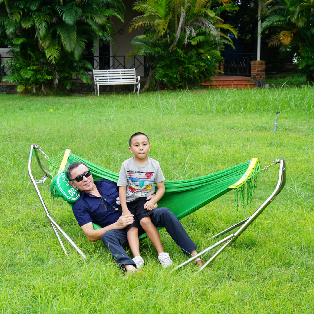 Ống thép, sơn tĩnh điện. đường kính 27.0mm, chiều dày 0.9mm. 4 thanh chống uốn cong, thẩm mỹ, thông thoáng, an toàn. Võng lưới sợi 100% polyester, mềm mịn, có độ co giãn, lưới Xuất