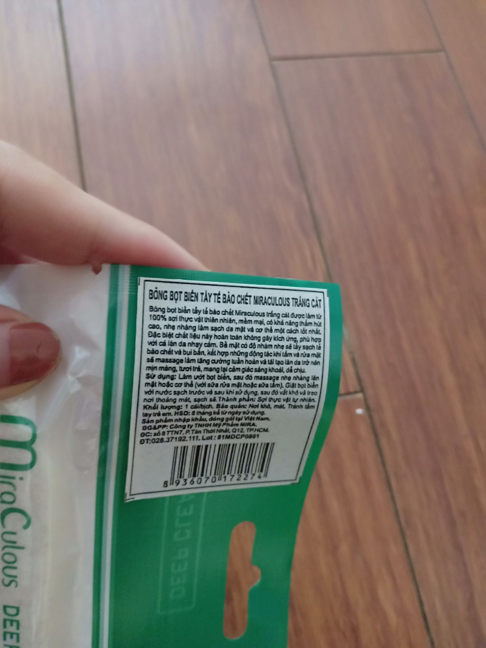 Mua tại TiktokBông bọt biển tẩy tế bào chết Miraculous trắng cát được làm từ 100% sợi thực vật tự nhiên mềm mại, độ nhám nhẹ giúp tẩy tế bào chết đem đến cảm giác sạch sâu, an toàn cho làn da mặt mỏng manh.- Bọt biển được phun nước khoáng để giữ độ mềm dẻo trước khi đóng gói.Hướng dẫn sử dụng Bông bọt biển tẩy tế bào chết SURI- Giặt bọt biển với nước sạch trước khi sử dụng. Sau khi thoa dung dịch tẩy trang, dùng miếng bọt biển massage và lau nhẹ nhàng.- Giặt lại miếng bọt biển với nước và vắt cho khô rồi cất ở nơi khô ráo, sạch sẽ để lần sau dùng tiếp.