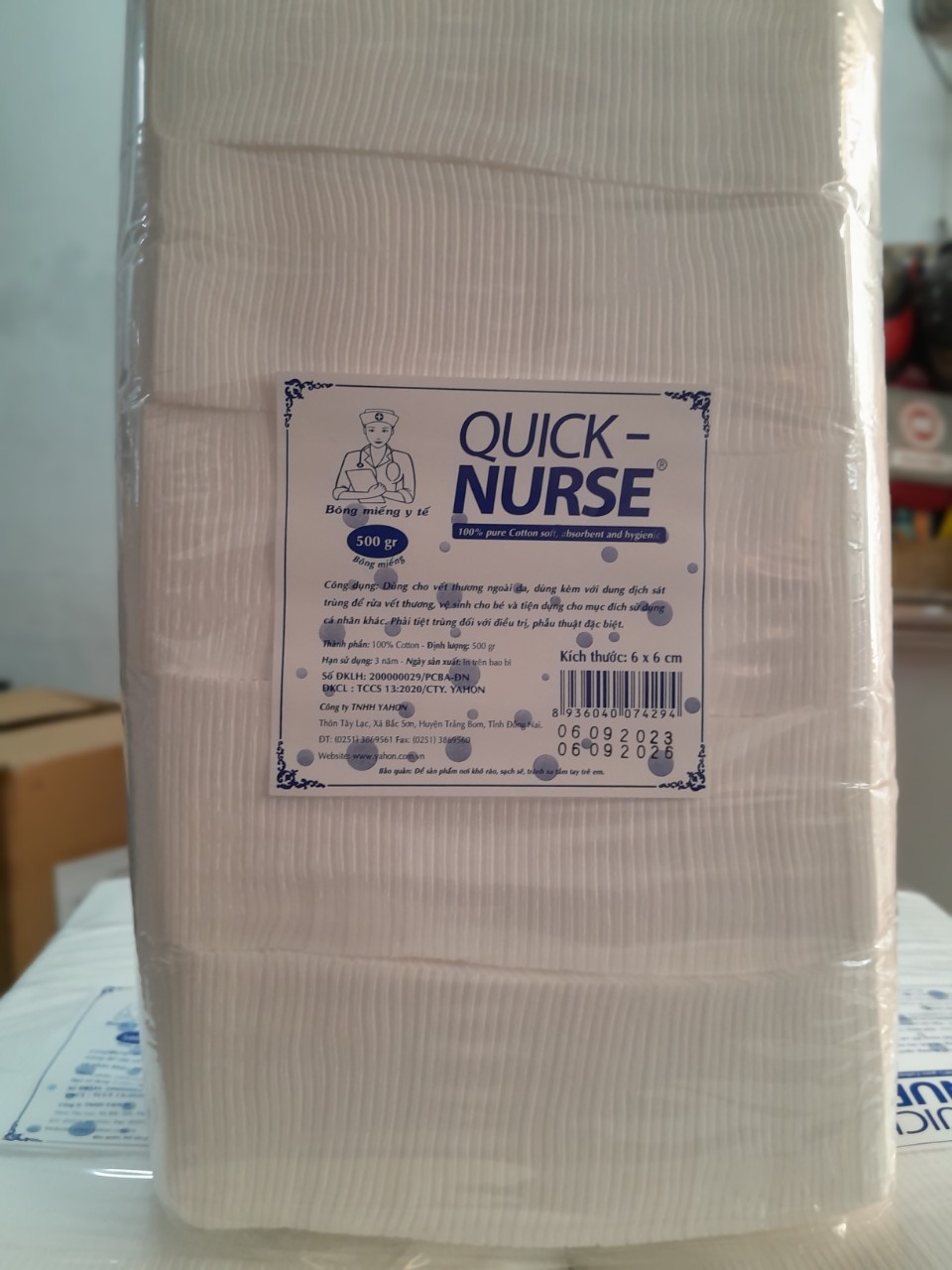 BÔNG CẮT QUICK-NURSE 6CM*6CM - 500GR Bông cắt Quick Nurse được sản xuất trên dây chuyền hiện đại, đáp ứng tiêu chuẩn ISO 9001:2015 và chứng chỉ CGMP. Với thành phần 100% cotton, quy cách
