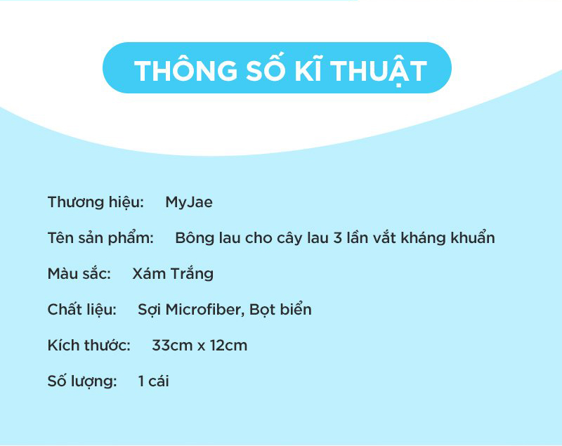 *Thông số kỹ thuật* - Thương hiệu: MyJae - Tên sản phẩm: Bông lau kháng khuẩn cho Cây lau nhà tự vắt kèm thùng 2 ngăn MyJae - Kích thước: 33 cm x12cm - Màu
