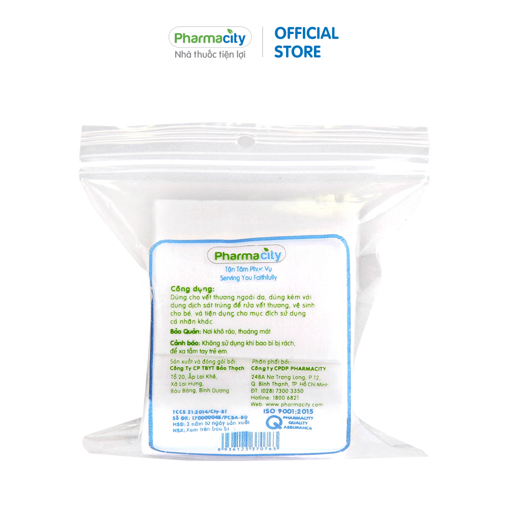 Gạc tiệt trùng Pharmacity được sản xuất trên dây chuyền hiện đại, đáp ứng tiêu chuẩn ISO 9001:2015. Với thành phần 100% cotton được tiệt trùng, sản phẩm được sử dụng trong nhiều trường hợp