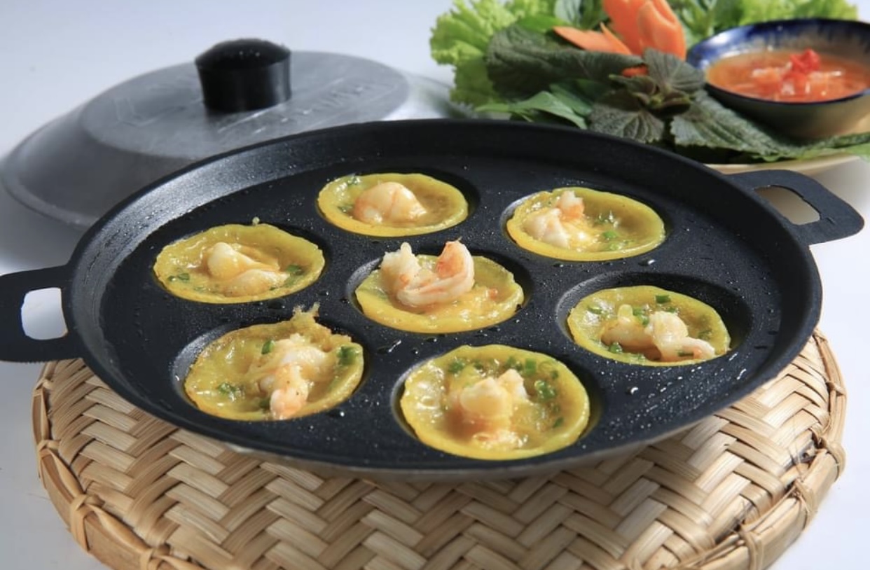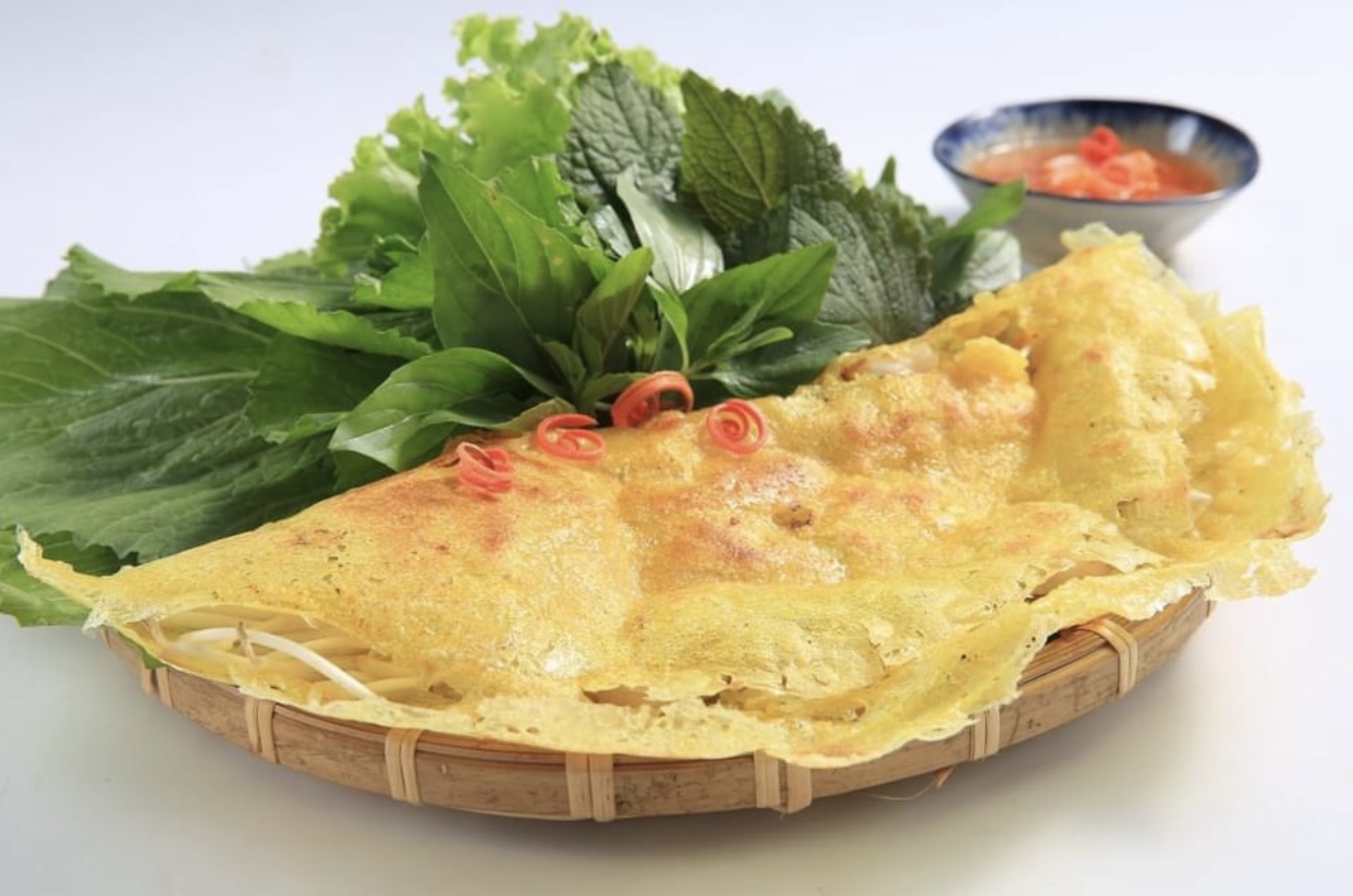 Bước 2 : Đun nóng chảo, cho 1 muỗng dầu ăn, thịt ba rọi heo, tôm hoặc tép, thịt gà, thịt vịt bầm nhuyễn hành tây vào chảo xào sơ. Múc 1 vá bột đã khuấy tráng mỏng và xoay tròn đều, cho giá, hẹ (củ hủ dừa), đậu xanh cà đã luộc chín, vào giữa bánh. Đậy nắp lại khoảng 1 phút cho bột chín. Thấy bánh bung lên, vàng và giòn thì lấy xẻng gập đôi bánh lại, xúc ra dĩa