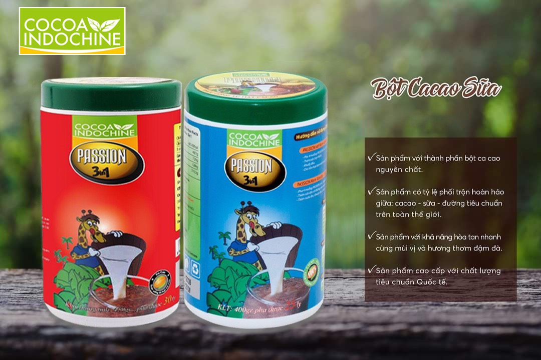 - Bột Cacao Hòa Tan Passion 3 In 1 Cocoa Indochine có mùi vị thơm ngon, giàu dinh dưỡng với sự kết hợp độc đáo giữa hương Sôcôla đen thơm nồng và hương vị Cappuccino đầy mê hoặc.