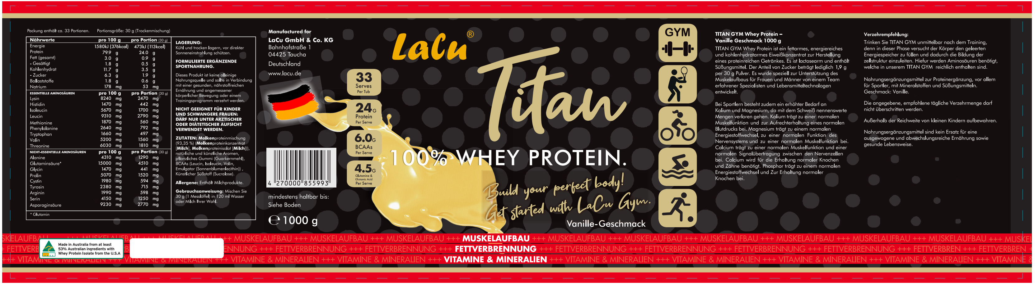 - Cải thiện sức khỏe tổng thể: Bổ sung kẽm và các chất dinh dưỡng khác giúp hỗ trợ sức khỏe toàn diện. Hương vị tuyệt vời: Lacu Whey Protein vị vani phù hợp với khẩu vị của mọi người, giúp việc bổ sung protein trở nên dễ dàng và thú vị hơn. Sản phẩm chất lượng nhập khẩu từ Đức Lacu Whey Protein được nhập khẩu nguyên hộp theo tiêu chuẩn khắt khe của Đức, đảm bảo chất lượng và an toàn cho người sử dụng. Sản phẩm được phân phối độc quyền bởi Lacu Việt Nam.