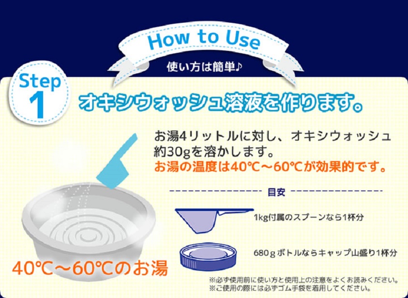 - Hòa tan khoảng 30 gram bột OXI WASH vào 04 lít nước ấm hoặc 8g cho 01 lít nước ấm 40~60 độ C, ngâm các đồ vật/ vật dụng cần tẩy trắng vào trong dụng dịch đã pha khoảng từ 5~10 phút sau đó tráng lại bằng nước sạch.