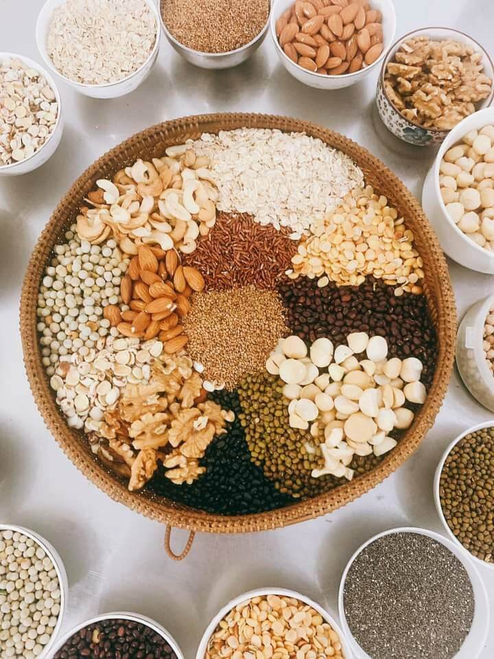 Thành Phần gồm 17 loại hạt: Hạt chia, óc chó đỏ, óc chó vàng, hạnh nhân, macca, yến mạch, điều, mè đen, mè trắng, hạt sen, đậu xanh, đậu đỏ, đậu đen xanh lòng, đậu trắng, đậu nành, gạo lức, huyết rồng, nếp lứ