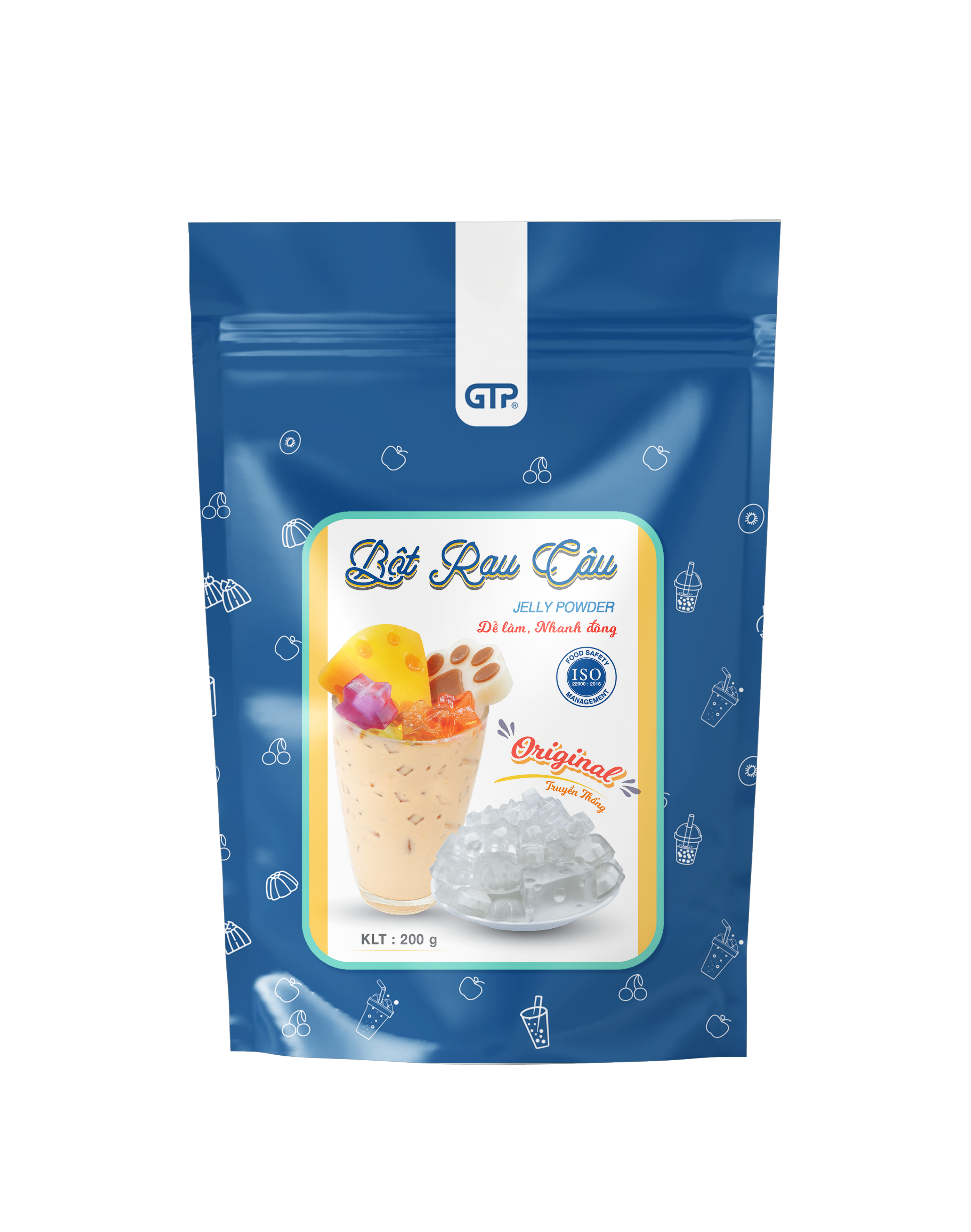 Chứng nhận: Sản xuất tại Việt Nam. 100% chính hãng. Chứng nhận tiêu chuẩn chất lượng quốc tế ISO 22000 : 2018. Mô tả: Bột Jelly (Bột rau câu) GTP được sản xuất theo công
