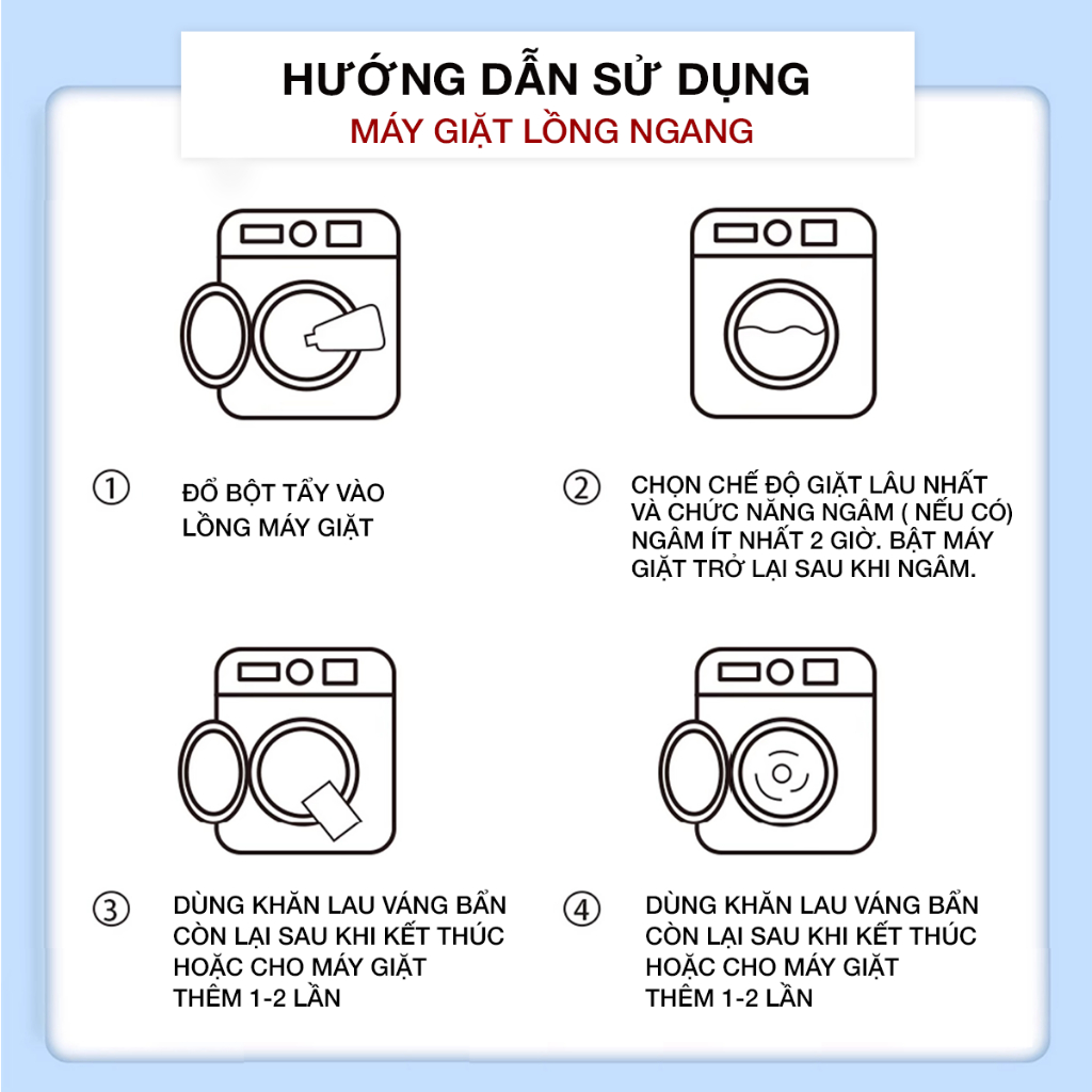 THÔNG TIN SẢN PHẨM: Trọng lượng: 200g. Thành phần: Oxygen factor, sodium peroxycarbonate, bioenzyme, coconut oil based surfactant. Công nghệ Oxygen: Không mùi, diệt khuẩn 99%, cuốn trôi cặn bẩn. HƯỚNG DẪN SỬ DỤNG: Đối với máy giặt lồng đứng: Bước 1: Đổ bột tẩy vào lồng máy giặt. Đồng thời tháo bộ phận lọc cặn ở thành trong của máy để vệ sinh. Bước 2: Chọn chế độ tốc độ vắt và nhiệt độ cao nhất, đợi nước xả đầy lồng giặt. Bước 3: Máy bắt đầu xoay 5 phút ấn tạm dừng. Ngâm máy giặt ít nhất 2 giờ (có thể ngâm qua đêm). Bật máy giặt trở lại sau khi ngâm. Lưu ý: Nếu vết bẩn quá lớn chủ động vớt ra khỏi lồng giặt. Bước 4: Sau khi kết thúc, dùng khăn lau váng bẩn còn đọng lại. Hoặc cho máy chạy thêm 1-2 lần giặt thường. Đối với máy giặt lồng ngang: Bước 1: Đổ bột tẩy vào lồng máy giặt. Bước 2: Chọn chế độ giặt lâu nhất của máy, tốc độ vắt và nhiệt độ cao nhất và chức năng ngâm (nếu có) và khởi động máy chạy. Có thể hứng chậu ở phần đường xả thải để kiểm tra kết quả. Bước 3: Sau khi kết thúc, dùng khăn lau váng bẩn còn đọng lại. Hoặc cho máy chạy thêm 1-2 lần giặt thường. Bước 4: Tháo và vệ sinh khay chứa nước nước giặt và bộ lọc cặn.