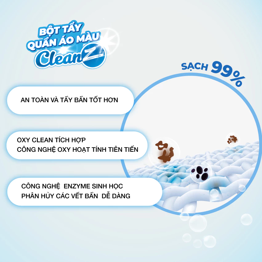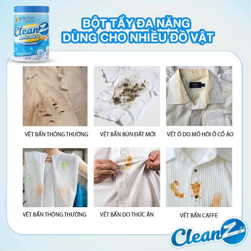 Có quá nhiều vết bẩn khác nhau trong sinh hoạt hàng ngày đặc biệt quần áo và đồ dùng của bạn, sẽ rất tốn rất nhiều chi phí để xử lý cho từng loại vết bẩn nhưng không hiệu quả và gây mùi không tốt cho sức khỏe, nắm bắt được điều đó, CleanZ ra mắt bột tẩy quần áo màu CleanZ