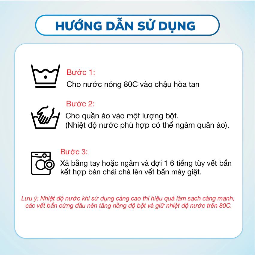 Công dụng: • Tẩy sạch các vết ố vàng, ố mốc, cặn bẩn cứng đầu trên quần áo. • Loại bỏ các vết bẩn do màu nhuộm, bùn đất, thực phẩm, dầu mỡ • Giúp
