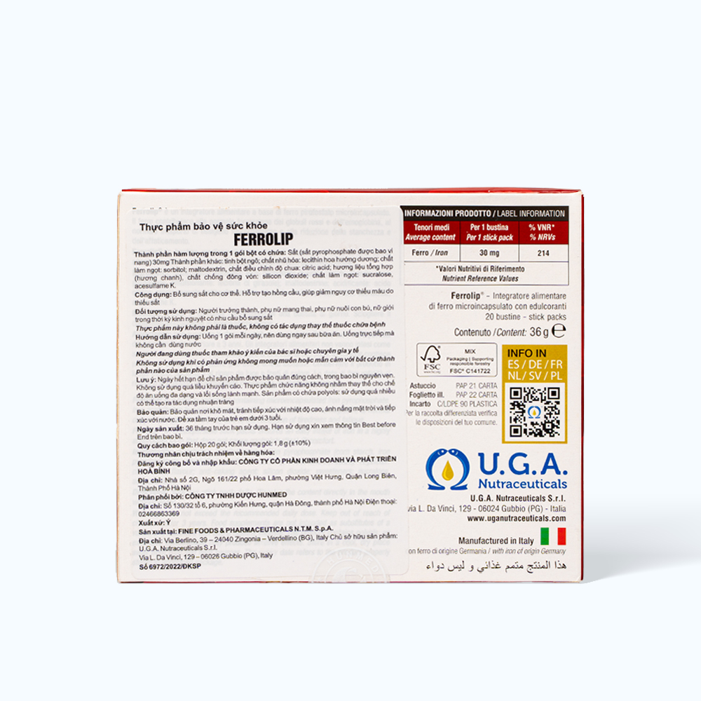 Thành phần của Bột uống FERROLIP Thành phần hàm lượng trong 1 gói bột có chứa: Sắt (sắt pyrophosphate được bao vi nang) 30mg Thành phần khác: tinh bột ngô; chất nhũ hóa: lecithin hoa