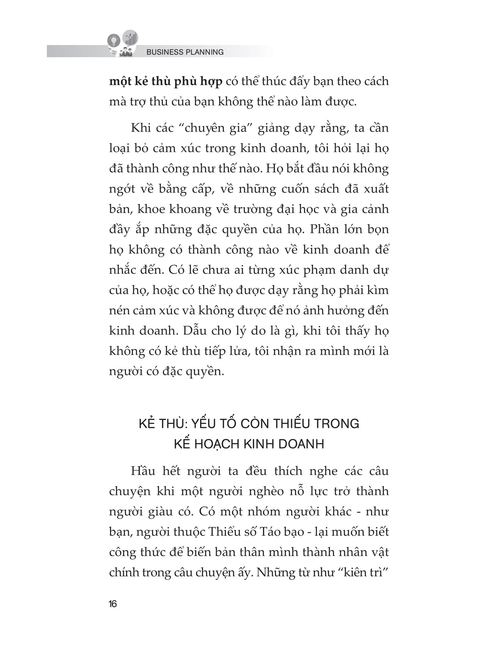 Trong cuốn “Business Planning: Phương pháp lập kế hoạch kinh doanh chi tiết và hiệu quả”, tác giả Patrick Bet-David hướng dẫn cách khai thác sức mạnh cảm xúc để xây dựng một kế hoạch kinh doanh vừa thực tế, vừa mang lại động lực lớn lao. Cuốn sách tập trung vào việc biến những khát khao thành chiến lược phát triển doanh nghiệp, tạo nên sự tăng trưởng bền vững qua nhiều thế hệ.