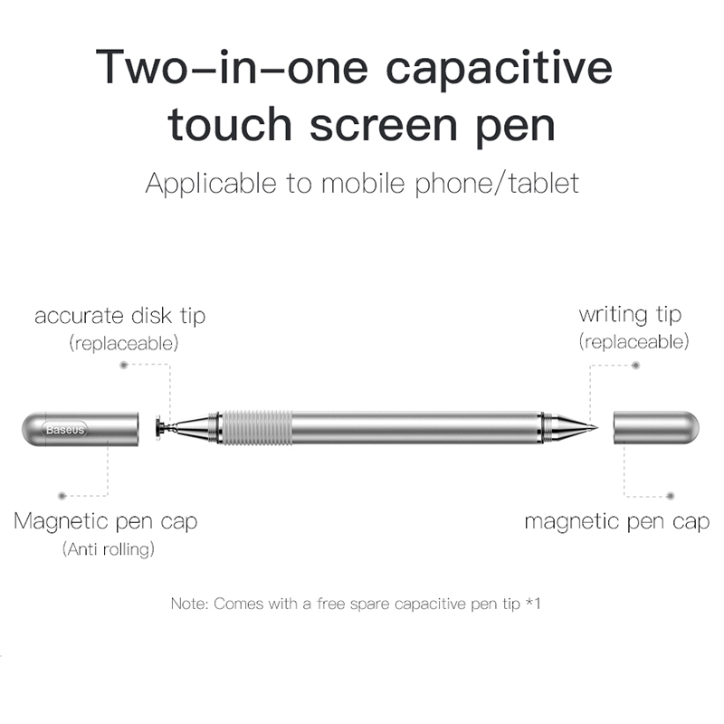 Bút cảm ứng chính hãng Baseus được thiết kế 2 đầu bút điện dung: 1 đầu dùng để viết và 1 đầu đĩa dùng cho việc vẽ tôi màu, chơi game v.v.