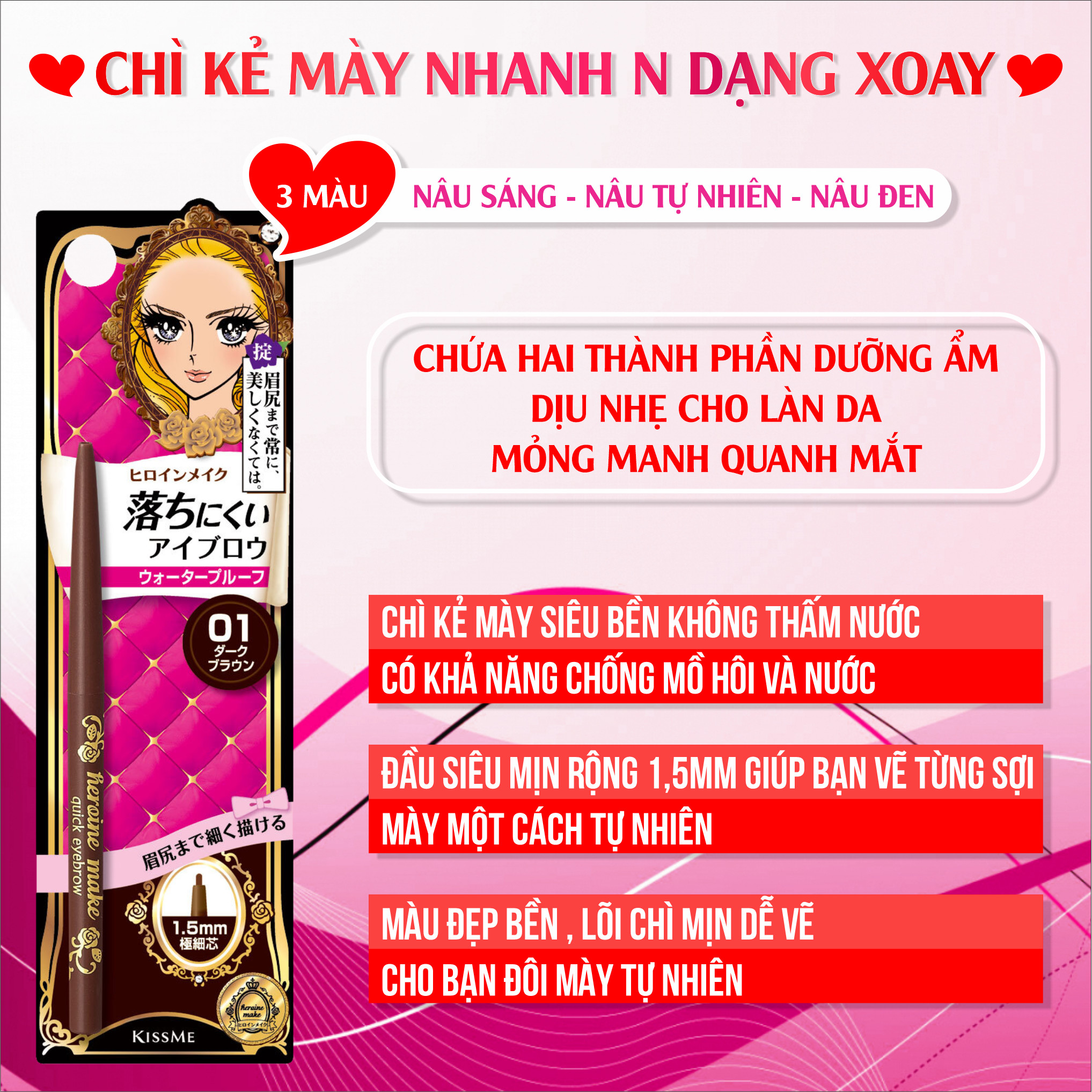 Bút Chì Sáp Kẻ Lông Mày Không Lem Trôi,Lõi Siêu Mịn Kissme Heroine Make Quick Eyeliner Màu Nâu Sáng Thông tin sản phẩm: Số Lô: In trên sản phẩm Thương hiệu: Kissme Xuất Xứ: Nhật