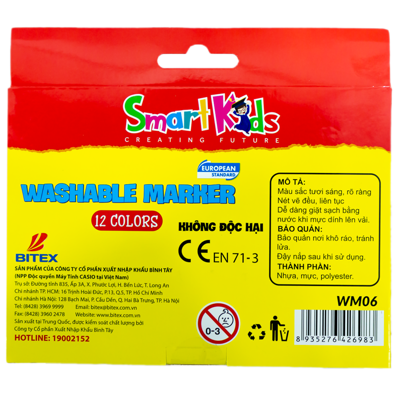 - Bút lông màu rửa được SK-FLT1001CL của Smartkids (12 màu) được sản xuất theo tiêu chuẩn chất lượng châu Âu EN 71 (1,2,3) và ASTM D4236. Nhờ sở hữu đầu lông kim được thiết kế đặc