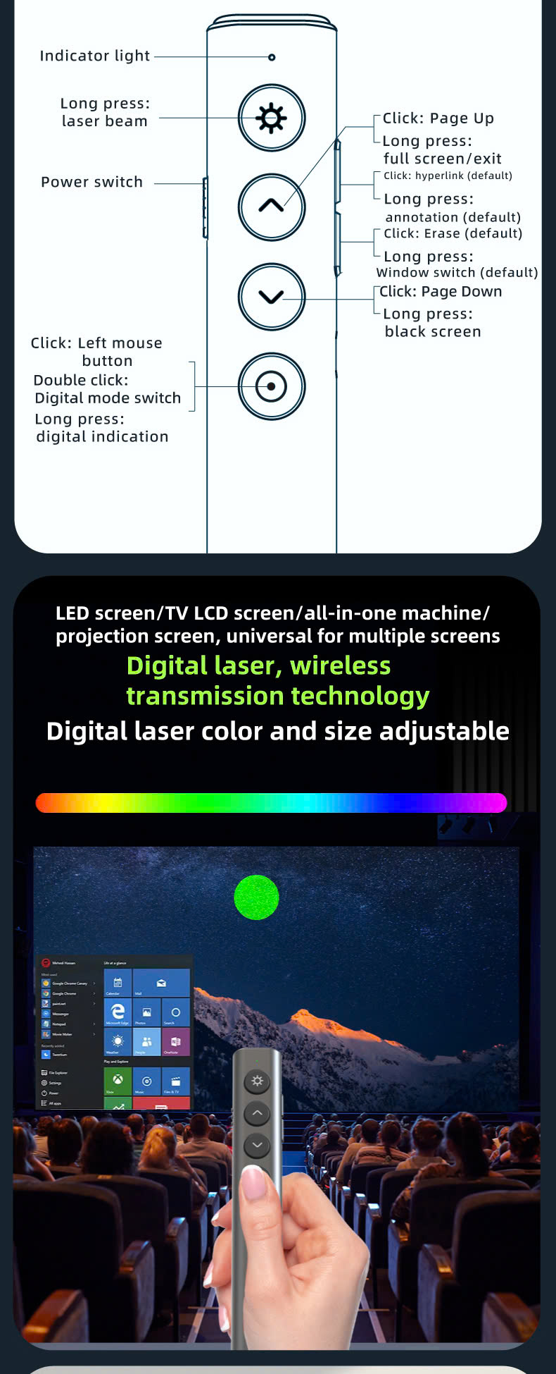 Laser xanh: Người dẫn chương trình không dây với tia laser màu xanh lá cây hiển thị tốt hơn trên nhiều nền khác nhau, ánh sáng xanh lục tươi sáng giúp bạn chỉ rõ mọi thứ