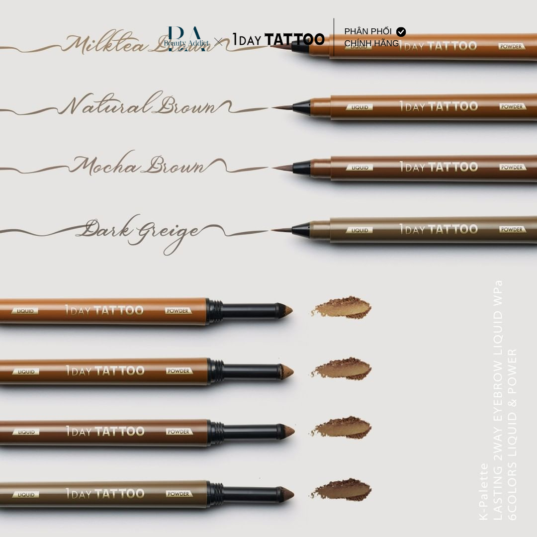 Mua tại TiktokVới thiết kế hiện đại, tiện lợi giúp tạo và giữ dáng mày cực chuẩn, cực dễ dàng cùng khả năng kháng nước, mồ hôi, bã nhờn hiệu quả cho hàng mày sắc nét thật tự nhiên suốt ngày dài. Có 2 đầu : 1 đầu dạng bột ( powder) và 1 đầu dạng nước ( liquid). Giúp chân mày đẹp tự nhiên, rất dễ sử dụng. K-Palette Lasting 2Way Eyebrow bảo đảm không trôi, không lem, bền màu, ra mồ hôi cũng ko sợ lem nha, có khả năng giữ nét vẽ như mới kẻ suốt cả ngày dài. Thành phần dịu nhẹ, an toàn, không gây dị ứng và thích hợp với mọi loại da. Chứa các thành phần dưỡng ẩm như HA, collagen, Hydrolyzed Conchiolin Protein (protein ngọc trai), Trehalose Có 4 màu: