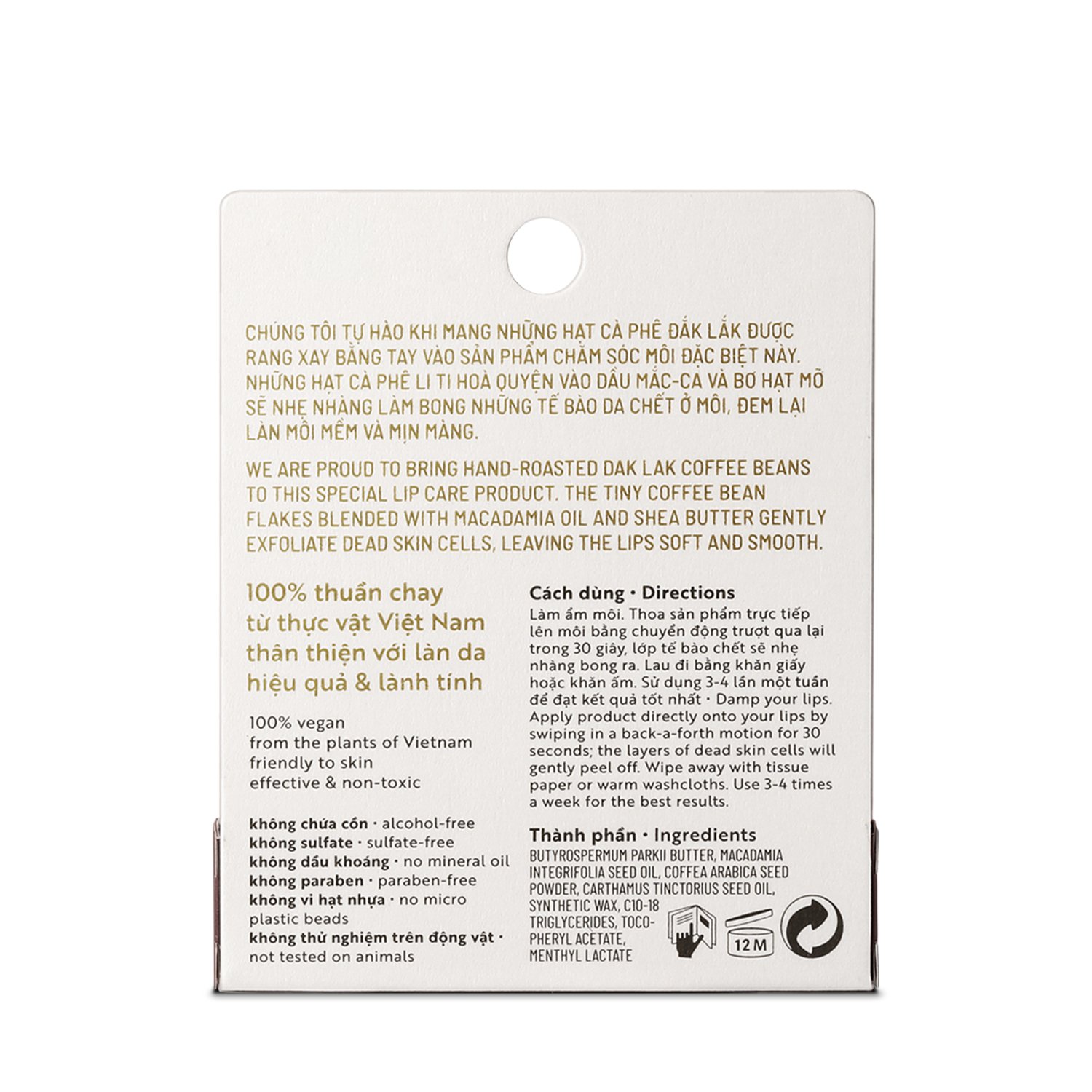 Cà phê đắk lắk làm sạch da chết môi cocoon. những hạt cà phê li ti được rang xay bằng tay hòa quyện vào dầu mắc-ca và bơ hạt mỡ, sẽ nhẹ nhàng làm bong
