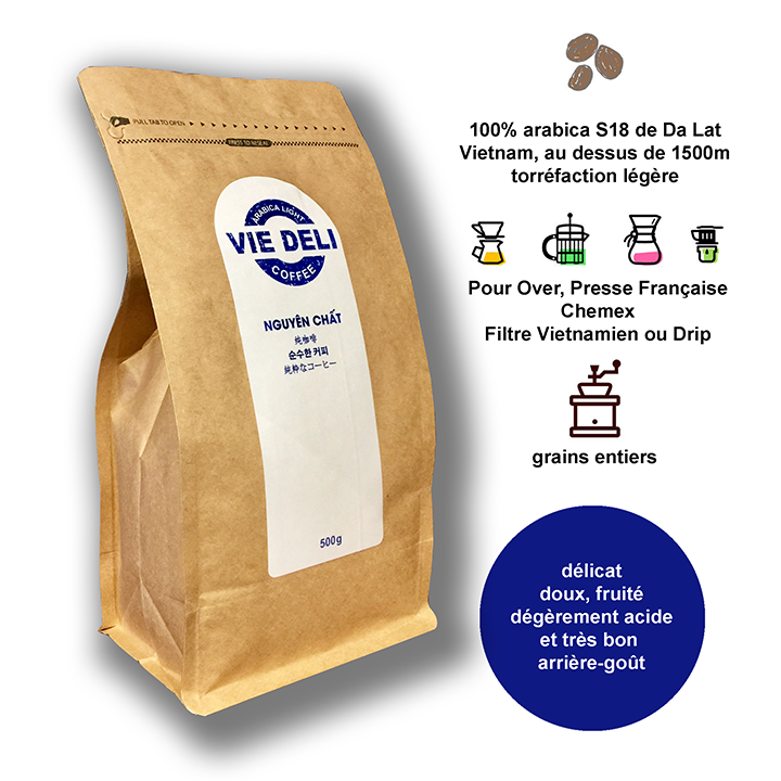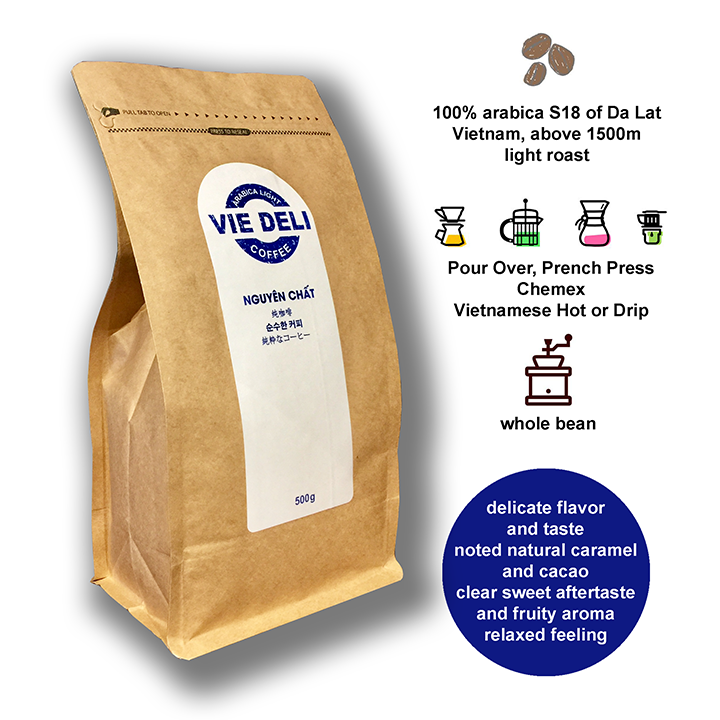 100% cà phê Arabica Cầu Đất của Đà Lạt, nổi tiếng thơm ngon, mọc ở vĩ độ thích hợp và độ cao trên 1.500m so với mực nước biển tại cao nguyên Lâm Viên, Việt Nam, chế biến rửa sạch hoàn toàn, nguyên chất, không tẩm, không hương liệu và không chất bảo quản, được rang bằng khí nóng ở mức nhẹ (light), nghiền thô hoặc mịn để pha bằng dụng cụ pha rót (Pour Over), bằng bình ép kiểu Pháp (French Press), hay bằng máy pha cà phê espresso, bình moka và các dụng cụ pha chế khác.