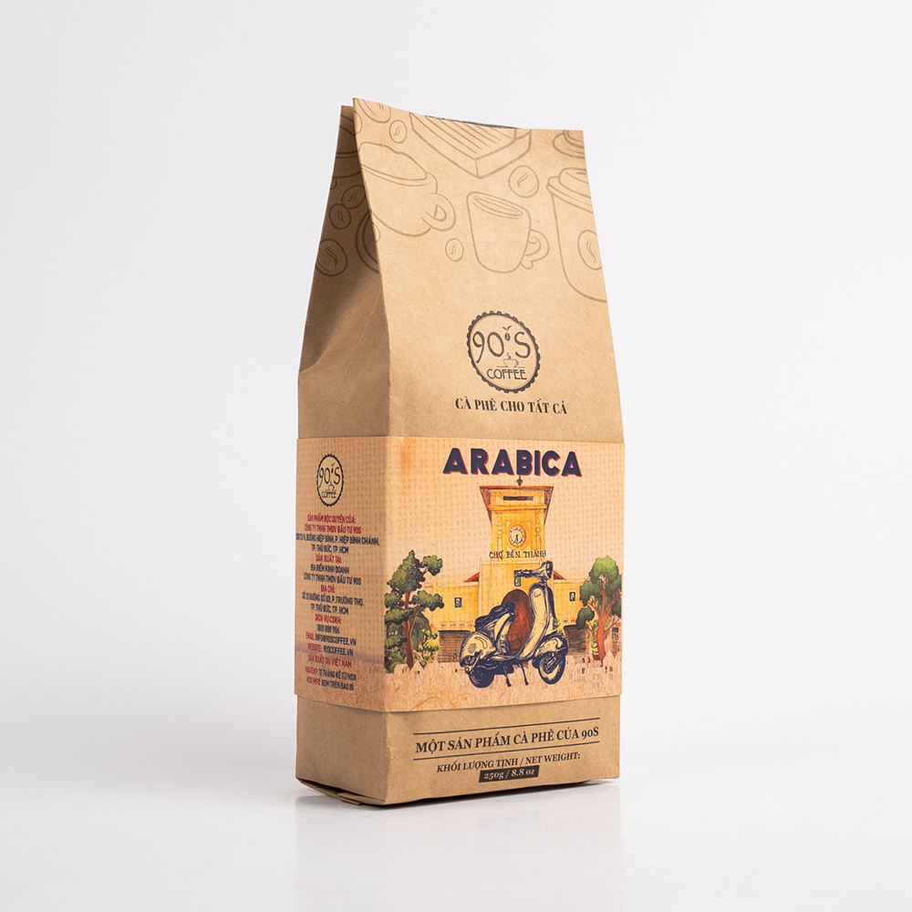 Cà phê hạt Arabica thuộc dòng sản phẩm cà phê rang mộc nguyên chất của 90S Coffee Vietnam. Đây là sản phẩm rất được ưa chuộng trong ngành cà phê bởi đặc tính đa dạng &